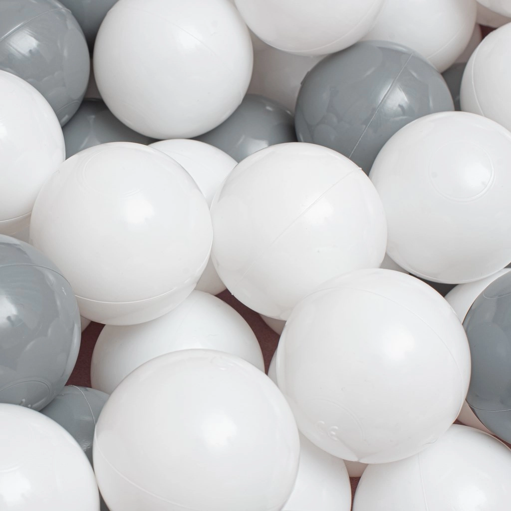 Der medfølger 150 plastbolde i hvid og grå. De opfylder sikkerhedsstandarder (fx EN-71, CPSC) og støtter motorik og koordination.
