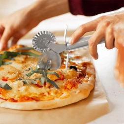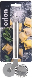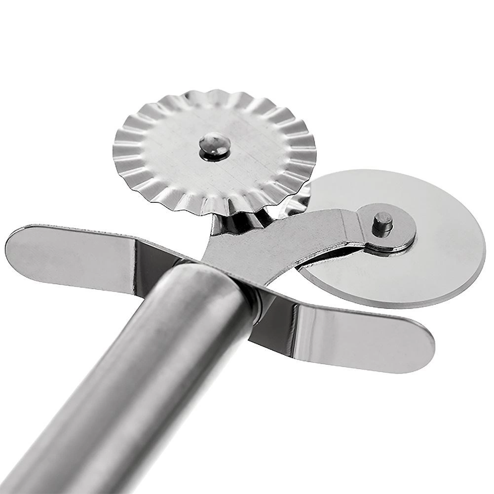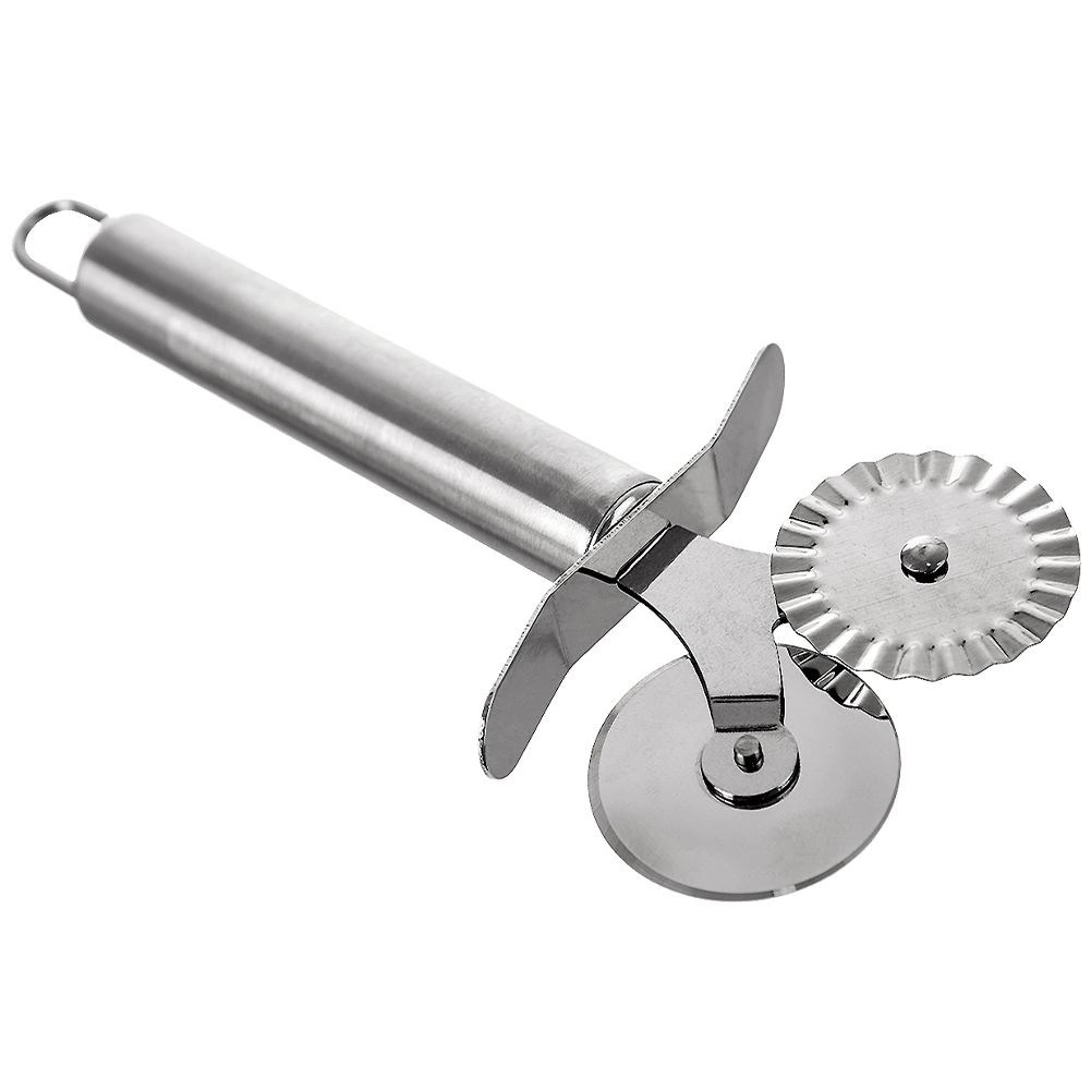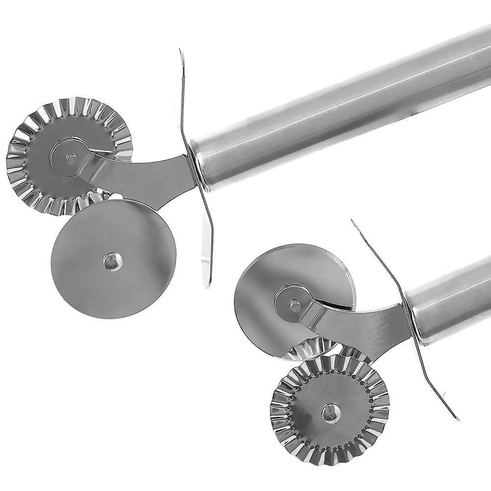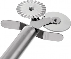 Den alsidige rulleskærer i rustfrit stål med to skærehjul gør det lettere at forberede hjemmelavet pasta, ravioli, småkager og salte kiks. Det glatte hjul skærer perfekt lige, mens det dekorative bølgede hjul skaber flotte takkede kanter og hjælper samtidig med at forsegle kanter på dejlommer eller ravioli.