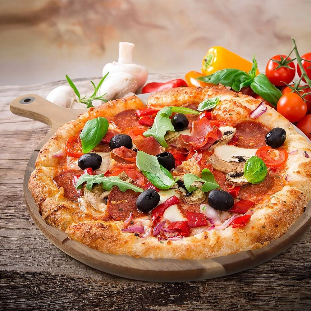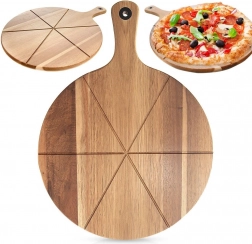 Praktisk pizzabræt i akacietræ med langt håndtag og føringsriller til 6 jævne stykker. Det er dobbeltsidet – den ene side med guider til præcis skæring, den anden glat til servering af oste, pålæg eller brød. Let, holdbart og fugtbestandigt, udstyret med ophængsøje for nem opbevaring.