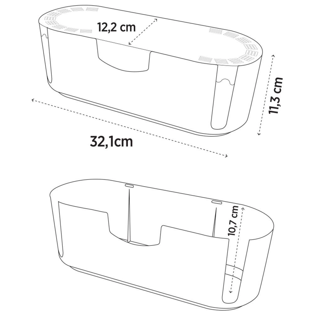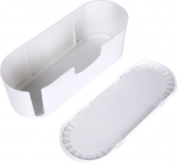 Takket være de kompakte mål 32 × 12 × 11,5 cm passer boksen både på bordet og i reolen, samtidig med at den rummer en almindelig strømskinne med flere udtag. Den glatte, let rengørlige overflade i hvid passer ind i et moderne interiør og beskytter kabler mod støv, fugt og mekaniske skader. Organisatoren øger også sikkerheden – den begrænser adgangen til udsatte stik og kabler.