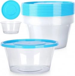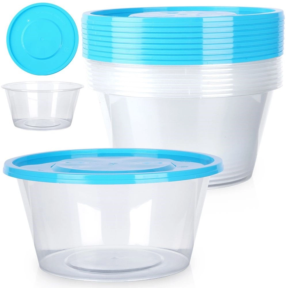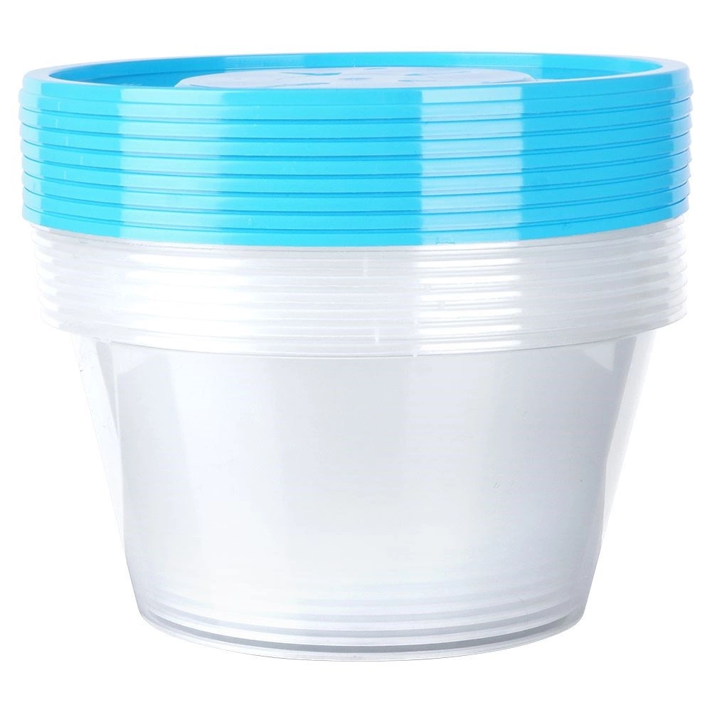 Med dette alsidige sæt med 10 runde beholdere på 650 ml får du styr på både køleskab og spisekammer. De gennemsigtige sider giver hurtigt overblik, det blå låg sikrer pålidelig lukning, og maden holder sig frisk længere. Takket være den stabelbare form sparer beholderne værdifuld plads.