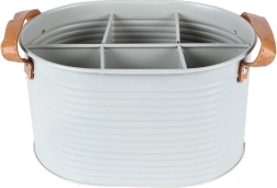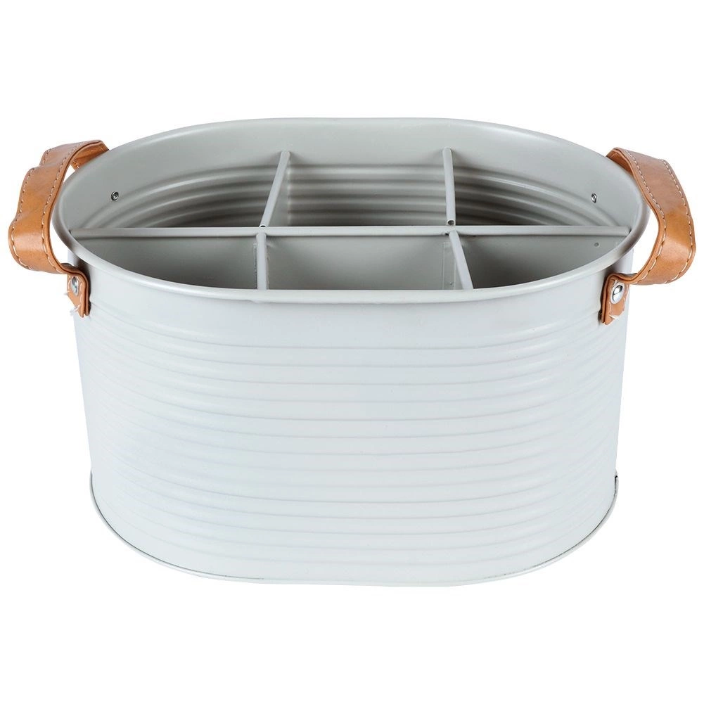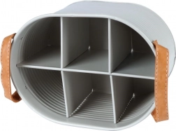 Elegant og robust organizer til transport af drikkevarer, der kombinerer funktionalitet og stilrent design. Det lysegrå metal med riflet overflade tåler daglig brug, mens de brune læderhåndtag sikrer et behageligt greb og let transport.