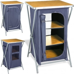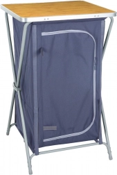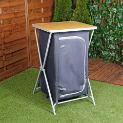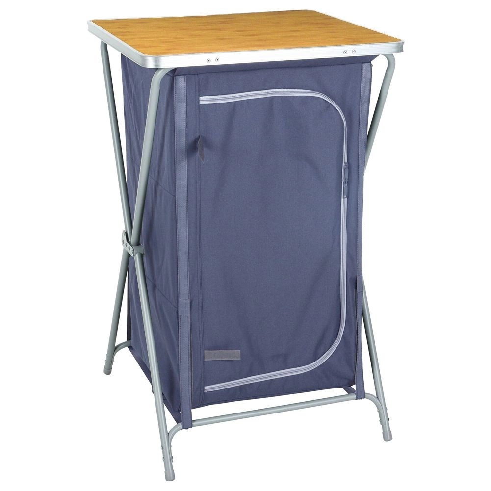 Med dette sammenklappelige campingskab får du overskuelig og hygiejnisk opbevaring på farten. Den robuste stålramme, kvalitetspolyester i mørkegrå og topplade i MDF med trælook giver en solid og mobil kombination, som du let kan pakke og slå op.