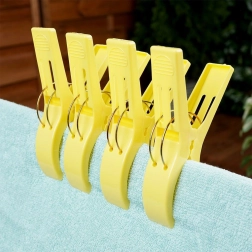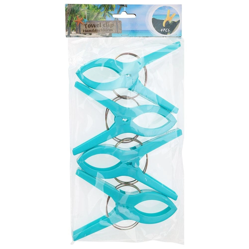 Klemmerne er fremstillet af kvalitets- og slidstærk plast, så de holder til krævende forhold ved vandet eller på camping. Sættet indeholder 4 styk i forskellige farver (sendes tilfældigt), og målene 15 × 10 cm giver et fast greb uden at beskadige stoffet.
