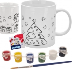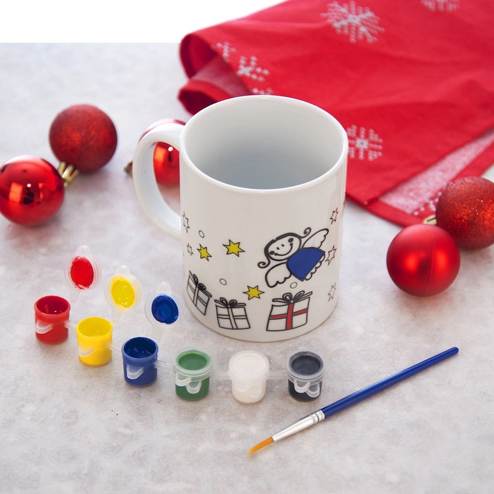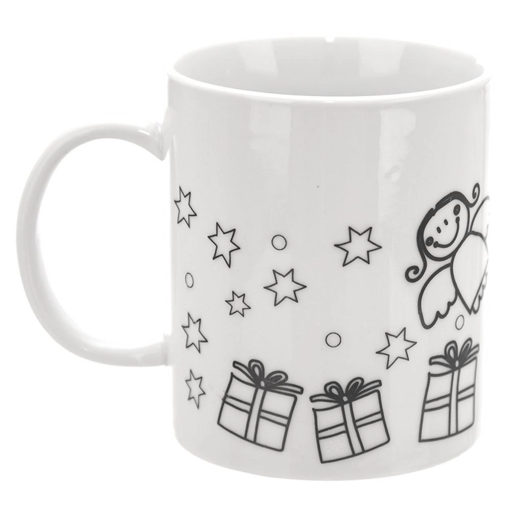 Lav dit eget personlige julekrus! Dette porcelænskrus til farvelægning med en kapacitet på 350 ml har fortrykte konturer af juletræ, gaver, stjerner og engel, og i pakken finder du en pensel og 6 akrylfarver. Kruset er egnet til opvaskemaskine og mikrobølgeovn, og efter brænding i ovn bevarer det de klare farver i lang tid.