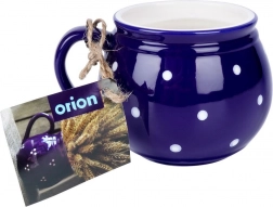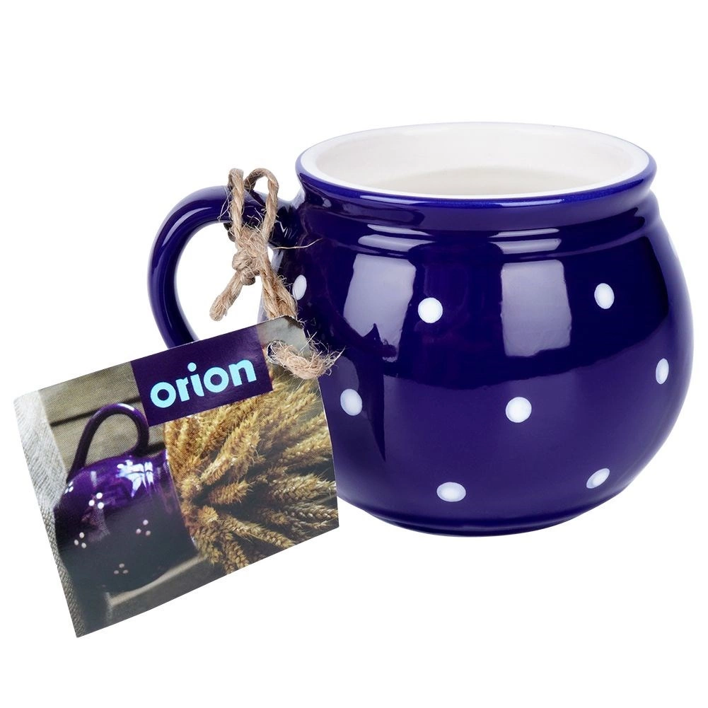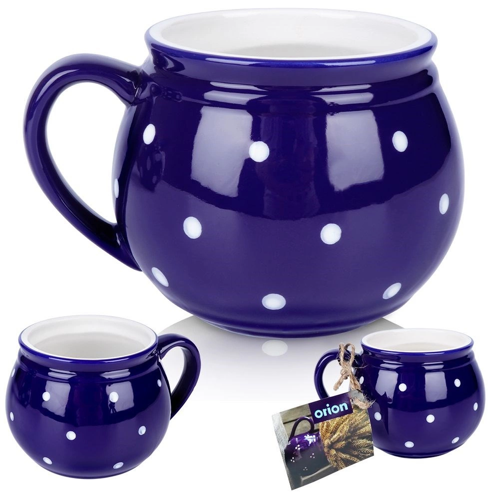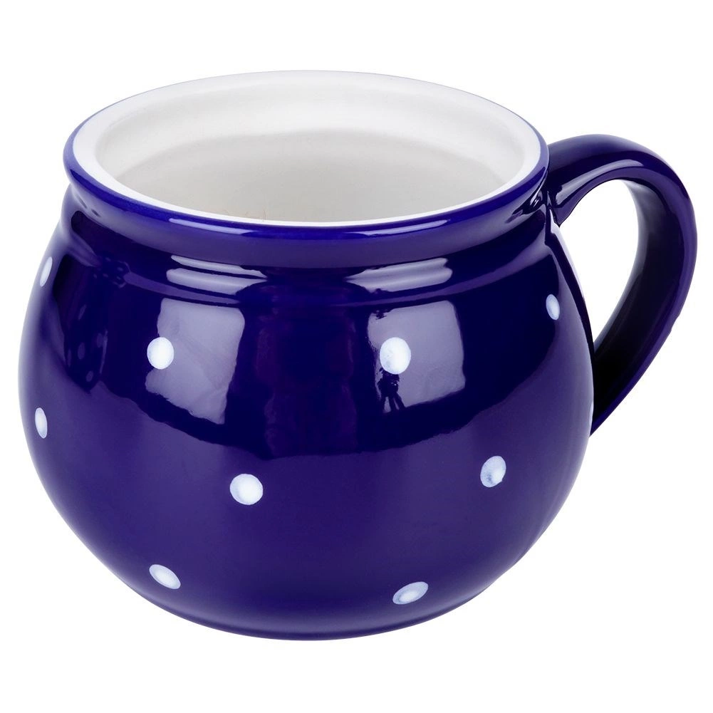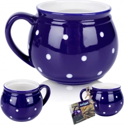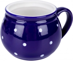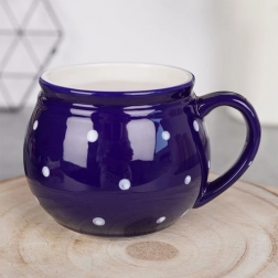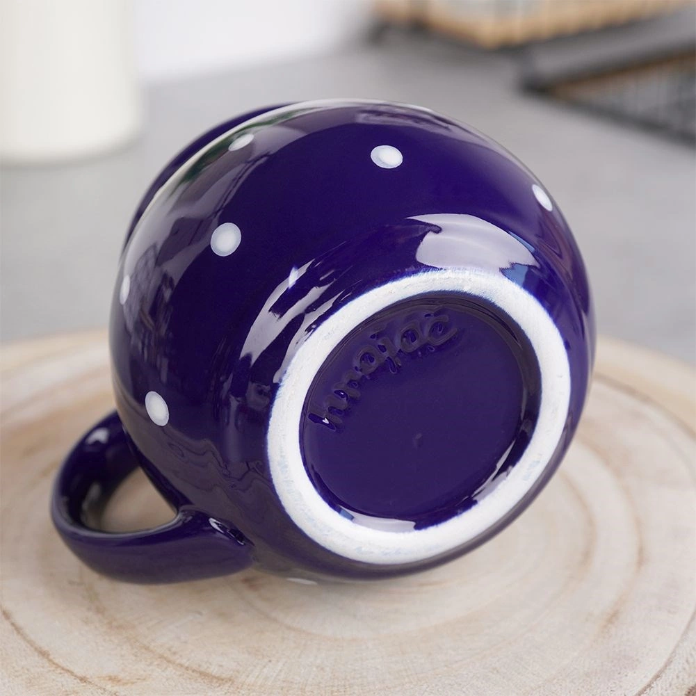 Stilfuldt keramikkrus med hank med en kapacitet på 200 ml i mørkeblå farve med hvide prikker, ideelt til kaffe, te, kakao og gløgg. Det har en behagelig ergonomisk hank, et klassisk tidløst design, og takket være kvalitetskeramik er det holdbart og sikkert til kontakt med fødevarer.