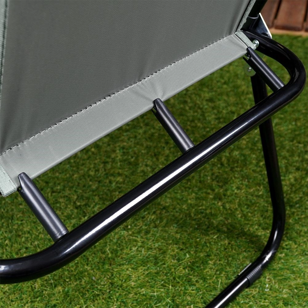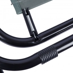 Stolen er lavet af kvalitetsmaterialer: slidstærkt polyesterstof i grå, der tåler daglig brug, en sort metalramme, som sikrer stabilitet og lang levetid, og plastarmlæn, som øger siddekomforten. Konstruktionen gør det muligt at folde hurtigt sammen og ud på få sekunder.