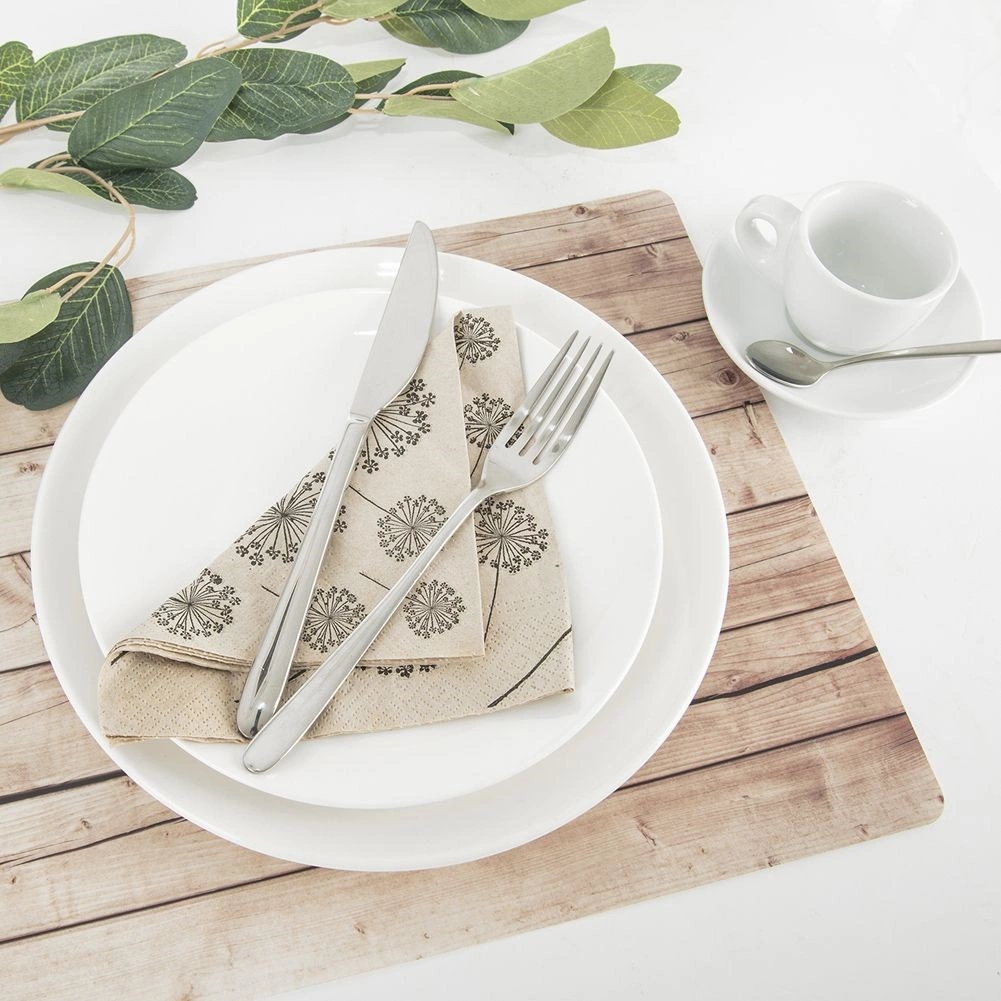 Praktisk og dekorativ bordskåner, som skaber en ensartet og æstetisk borddækning til tallerkener og bestik. Det realistiske trælook giver bordet et hyggeligt udtryk og sikrer samtidig pålidelig beskyttelse af overfladen mod pletter, varme og mindre mekaniske skader.
