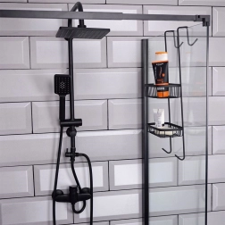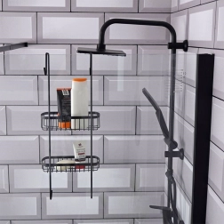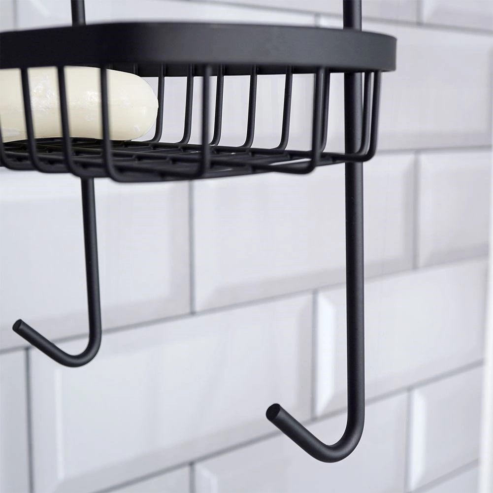 Denne hængende brusehylde er designet til ophæng på den øverste kant af glasvæggen i brusekabinen. Med to trådkurve og nederste kroge holder den dine badeværelsesartikler overskueligt organiseret og altid lige ved hånden. Det minimalistiske loft-design i sort passer til ethvert moderne badeværelse.