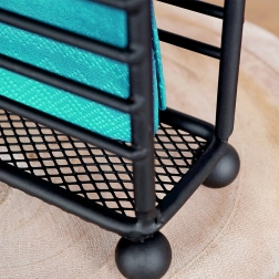 Takket være de åbne sidelister og metalgitteret er håndteringen hurtig og bekvem. Skridsikre kugleben sikrer stabilitet selv i vind, så holderen er velegnet til både indendørs og udendørs brug – på terrasse, altan og i haven. Det minimalistiske look er nemt at kombinere med enhver borddækning.