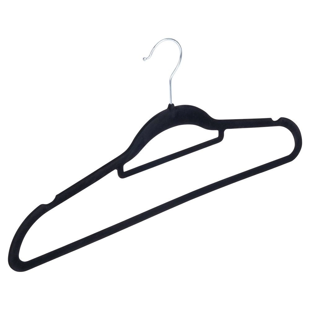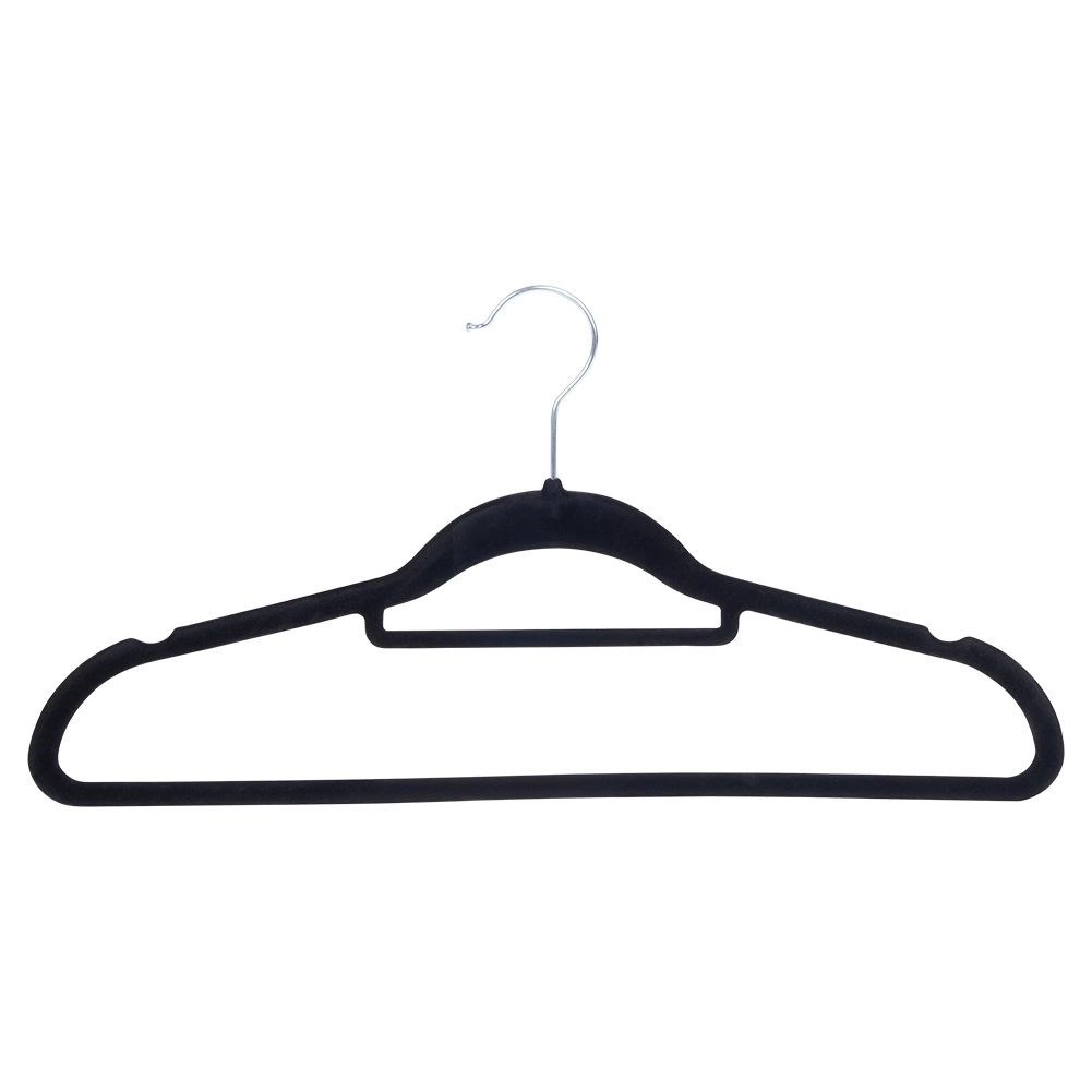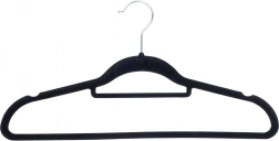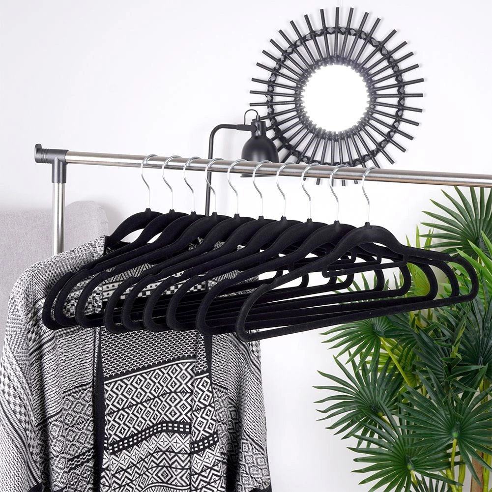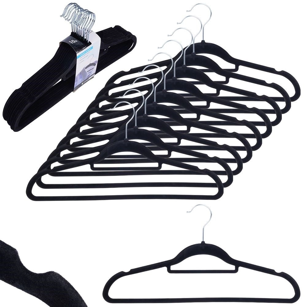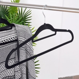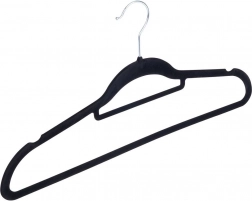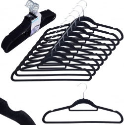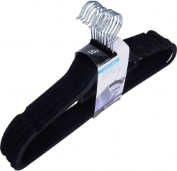 Praktisk sæt med 10 tynde bøjler med blød velouroverflade hjælper med at holde skabet organiseret og sparer plads. Den skridsikre overflade holder tøjet sikkert på plads, mens den drejelige metalkrog gør det nemt at hænge i enhver retning.
