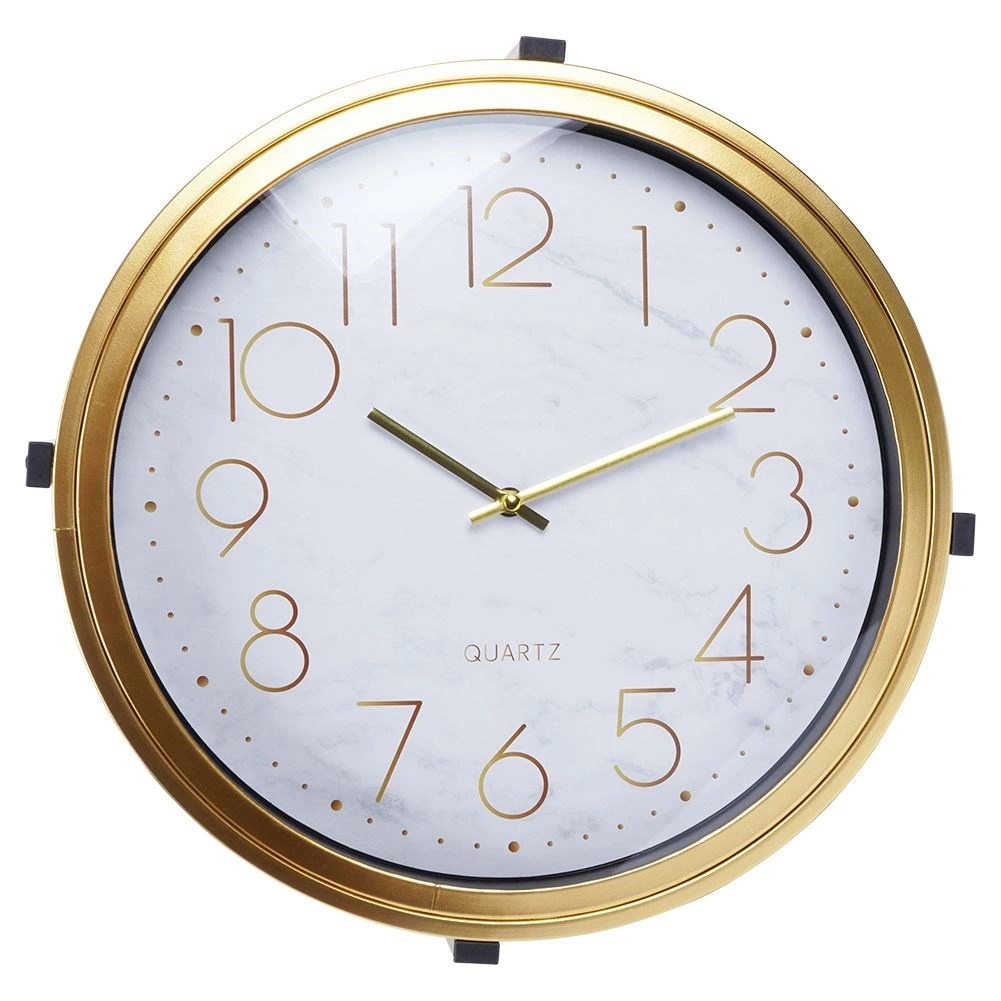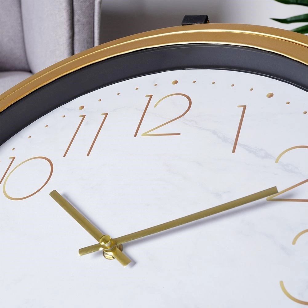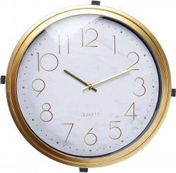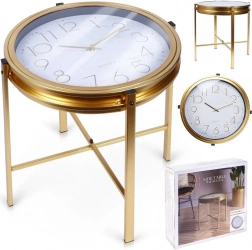 Dette originale 2-i-1-bord kombinerer funktionen af et lille aflægningsbord og et vægur direkte i bordpladen. Uret er dækket af solidt glas, og takket være den hvide baggrund og de gyldne elementer er det let at aflæse selv på afstand. Den elegante gyldne finish passer til både moderne og klassiske interiører og bliver et markant dekorativt element.
