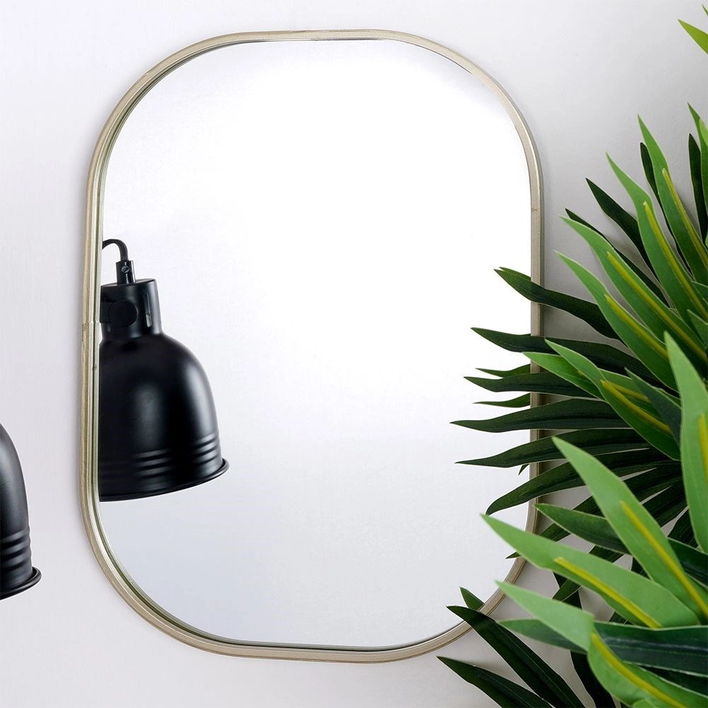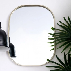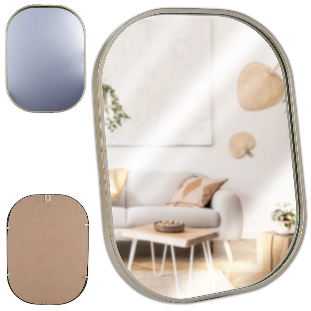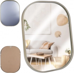 Det designede ovale spejl i champagneguld fungerer både som et praktisk og æstetisk supplement. Metalrammelisten virker elegant og tidløs, beskytter kanterne og sikrer lang holdbarhed. Spejlet kan nemt hænges på væggen med den forberedte ophængning, hvilket understreger rummets atmosfære og får det optisk til at virke lysere og større.