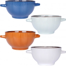 Skålene i harmoniske farver (hvid, blå, orange/lysebrun og grå) har et stilfuldt fiske-/chevronrelief og en kontrastkant, så de tager sig flot ud på ethvert bord. De er perfekte ikke kun til supper og cremer, men også til morgenmadsprodukter, yoghurt, frugt, salater eller salte og søde snacks.