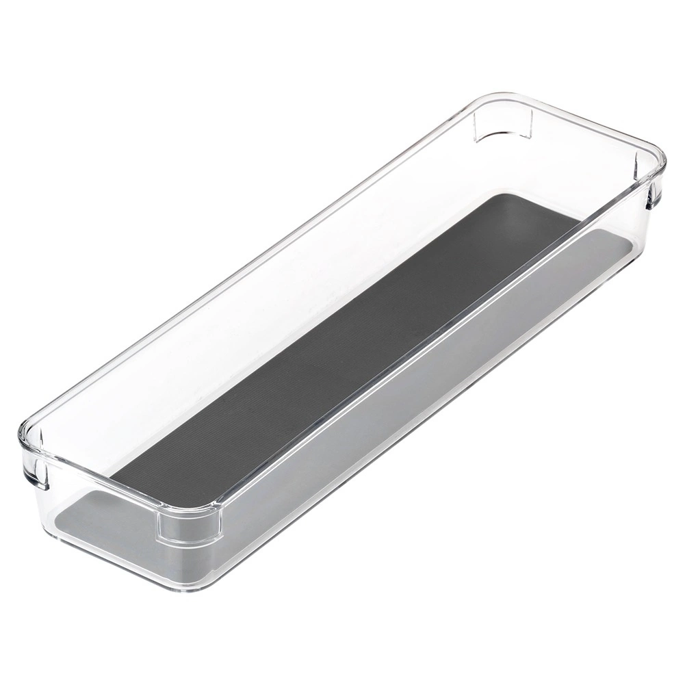 Praktisk og alsidig skuffeorganisator i transparent plast med grå gummiindsats holder orden i køkken, kontor og badeværelse. Med målene 32,5 × 9 × 4,5 cm passer den i de fleste skuffer og skabe. Robust udførelse, skridsikre fødder og let aftagelig, vaskbar indsats sikrer stabilitet og overblik over dine ting. Ideel til bestik, skriveredskaber, kosmetik samt småting i værkstedet eller køleskabet.