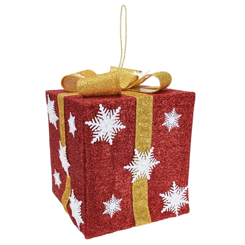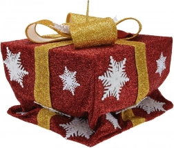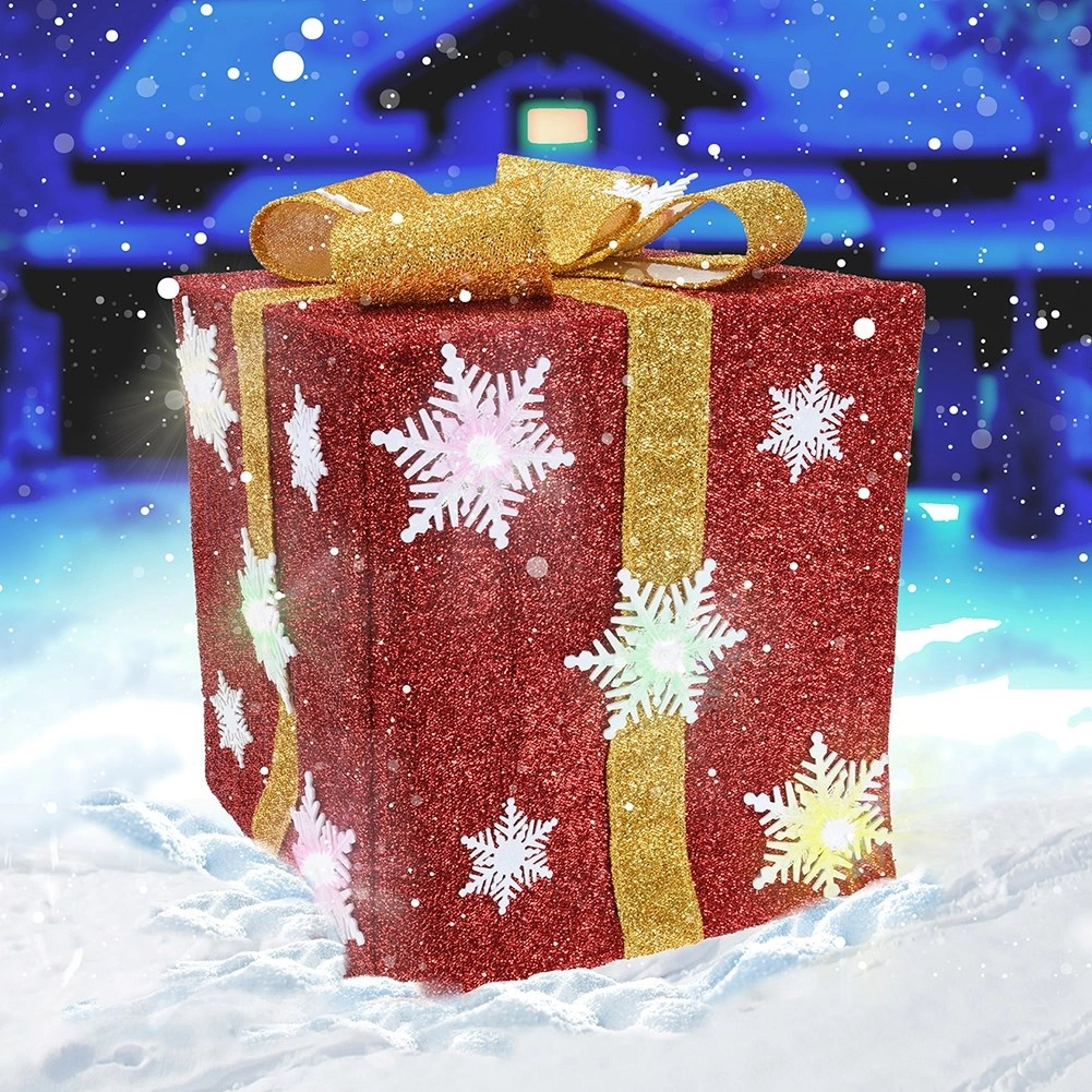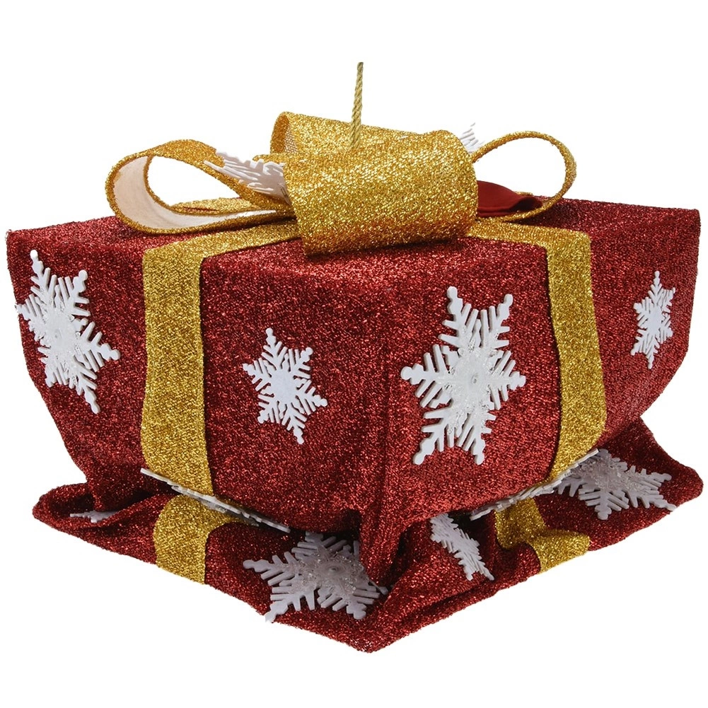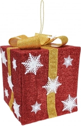 Skab perfekt, festlig stemning hjemme og i haven med en lysende gave i dyb rød, dekoreret med hvide snefnug og en gylden sløjfe. Integrerede LED-dioder (14 stk.) med farveskift oplyser dekorationen med et blødt, attraktivt lys. Takket være den sammenklappelige konstruktion i metal med dekorativ overflade er pynten robust og samtidig let at opbevare.