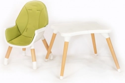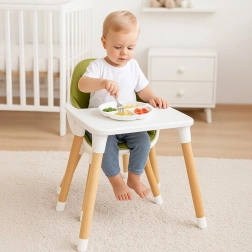 Høj stol til fodring, lav børnestol og sæt med bord + stol i ét produkt sparer plads og penge og tilpasser sig hver vækstfase.