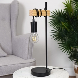Denne moderne bordlampe i mat sort med træelement passer perfekt til interiører i loft-, skandinavisk og moderne stil. Kombinationen af metal og naturtræ virker elegant og tidløs og giver behageligt ambient og arbejdslys.