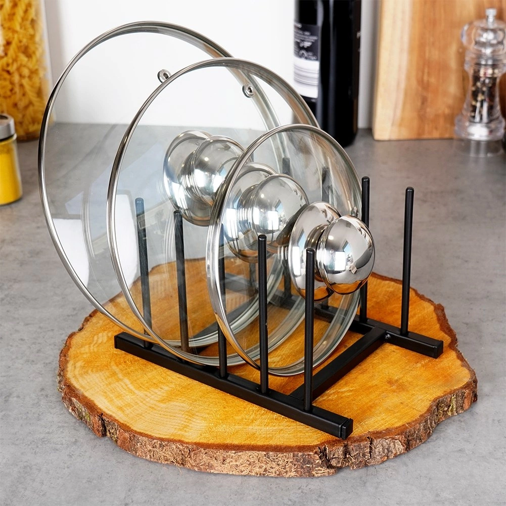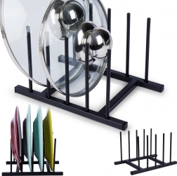 Skab ro i køkkenet og hav altid låg og tallerkener ved hånden. Metalstativet med solid rektangulær base holder servicen i lodret position, sparer plads og sikrer god luftcirkulation for nem tørring. Det minimalistiske sorte design passer til både moderne og klassiske interiører.