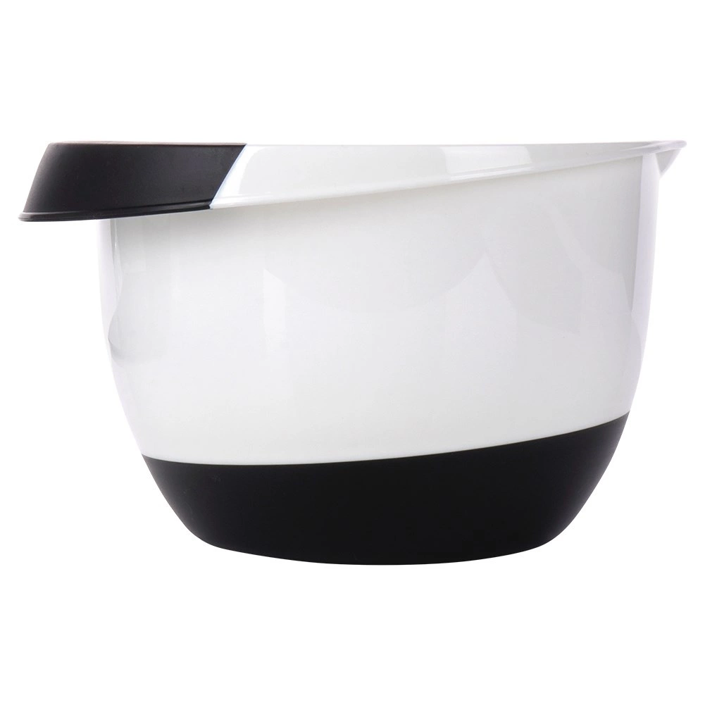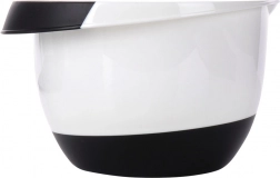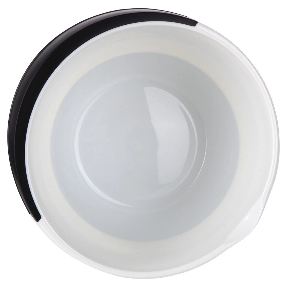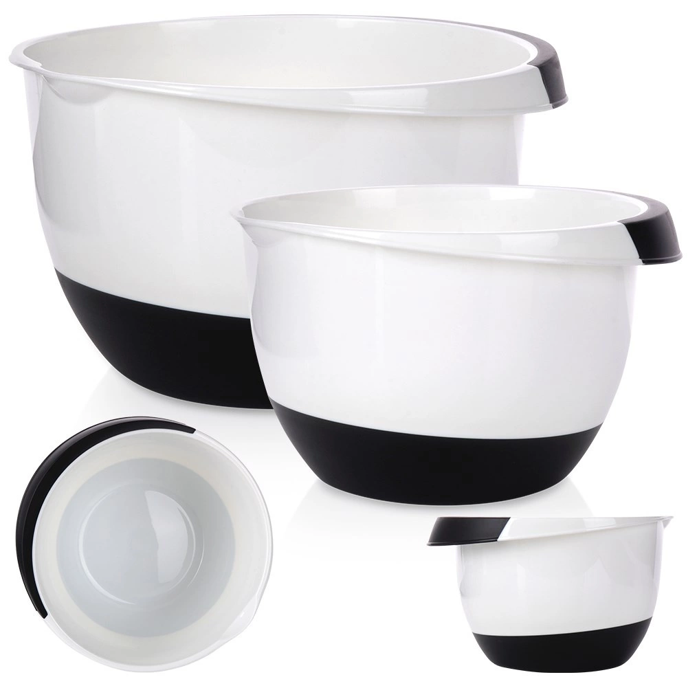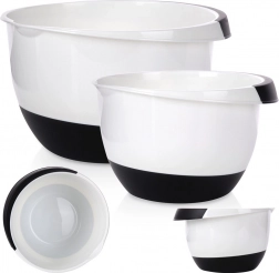 Universelt sæt køkkenrøreskåle i hvid med sorte, skridsikre bunde for maksimal stabilitet på køkkenbordet. Takket være de integrerede håndtag og tuden er hældning af dej eller saucer rent og præcist. Skålene er lette at vedligeholde, meget lette og samtidig holdbare, så de passer til daglig madlavning og bagning.