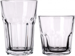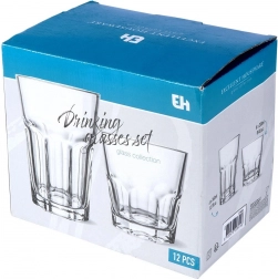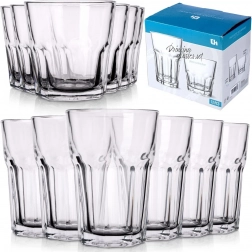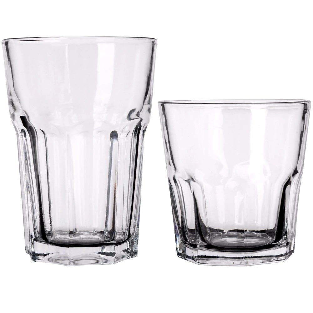 Praktisk sæt med tolv glas i to størrelser til hverdag. Indeholder 6 mindre glas på 230 ml og 6 større på 330 ml af klart, holdbart glas med effektfuld facetslibet dekoration. De er alsidige til vand, juice, læskedrikke og cocktails, stabile takket være den kraftige bund og tåler opvaskemaskine for nem vedligeholdelse.
