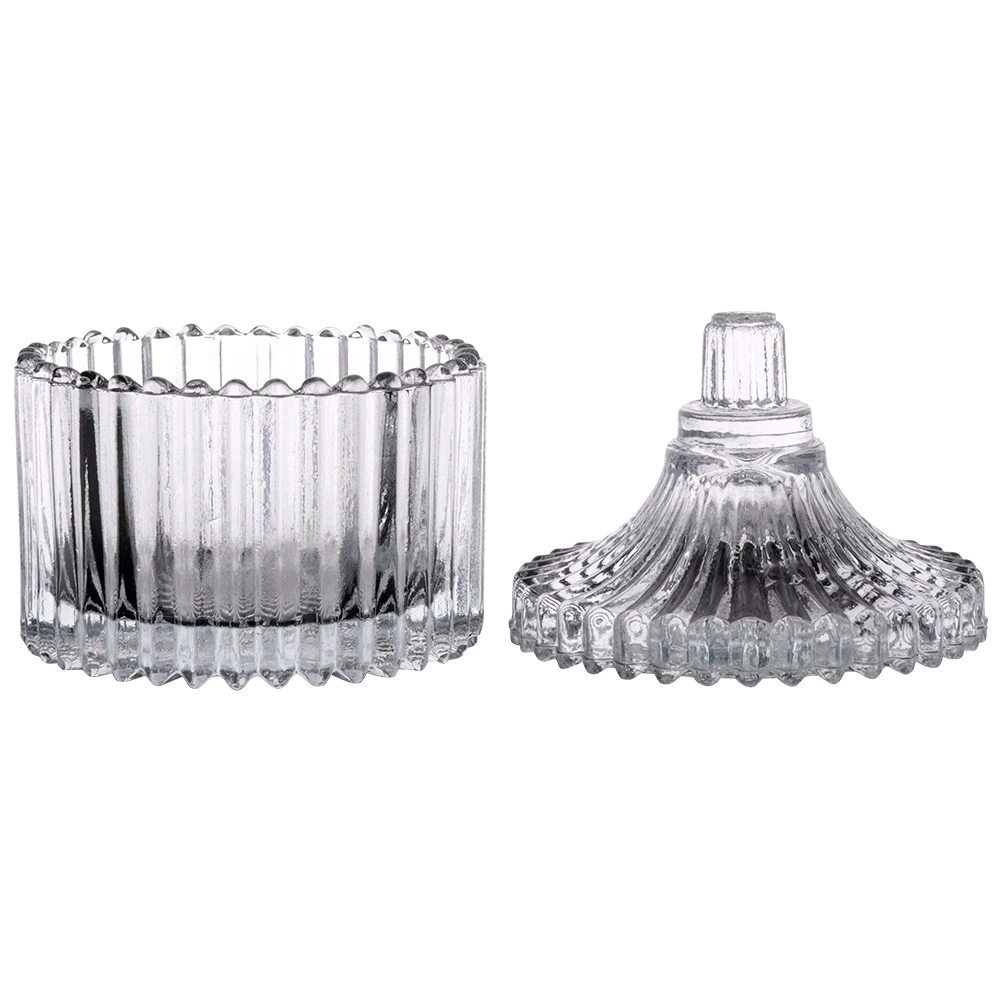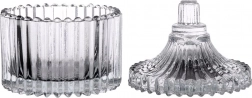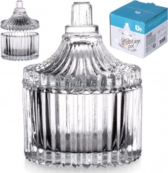 Stilfuld glas-sukkerskål med låg i kompakte mål 6,5 × 9 cm og en kapacitet på 80 ml er et fremragende valg til hverdagsbrug såvel som festlige lejligheder. Den riflede udsmykning giver et strejf af vintage-elegance, og det klare glas gør det let at se indholdet.