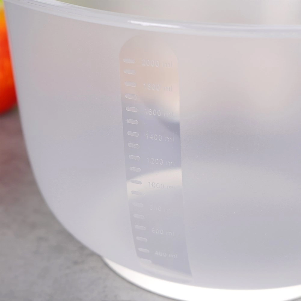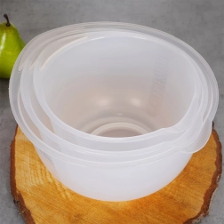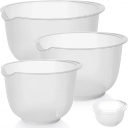 Dette sæt køkkenskåle i kvalitets, semitransparent plast dækker de fleste opgaver i køkkenet – fra at røre dej og piske cremer til at forberede salater. Skålene kan nemt nestes for at spare plads i skabet, og takket være måleskalaen på indersiden kan du måle både flydende og tørre ingredienser præcist.