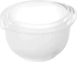 Universelt sæt med tre køkkenskåle på 1,5 l, 2 l og 2,5 l til daglig madlavning. Hver skål har en praktisk tud, integreret måleskala og komfortabelt håndtag. Takket være den skridsikre bund står de stabilt under arbejdet, de er lette, holdbare og kan vaskes i opvaskemaskinen.