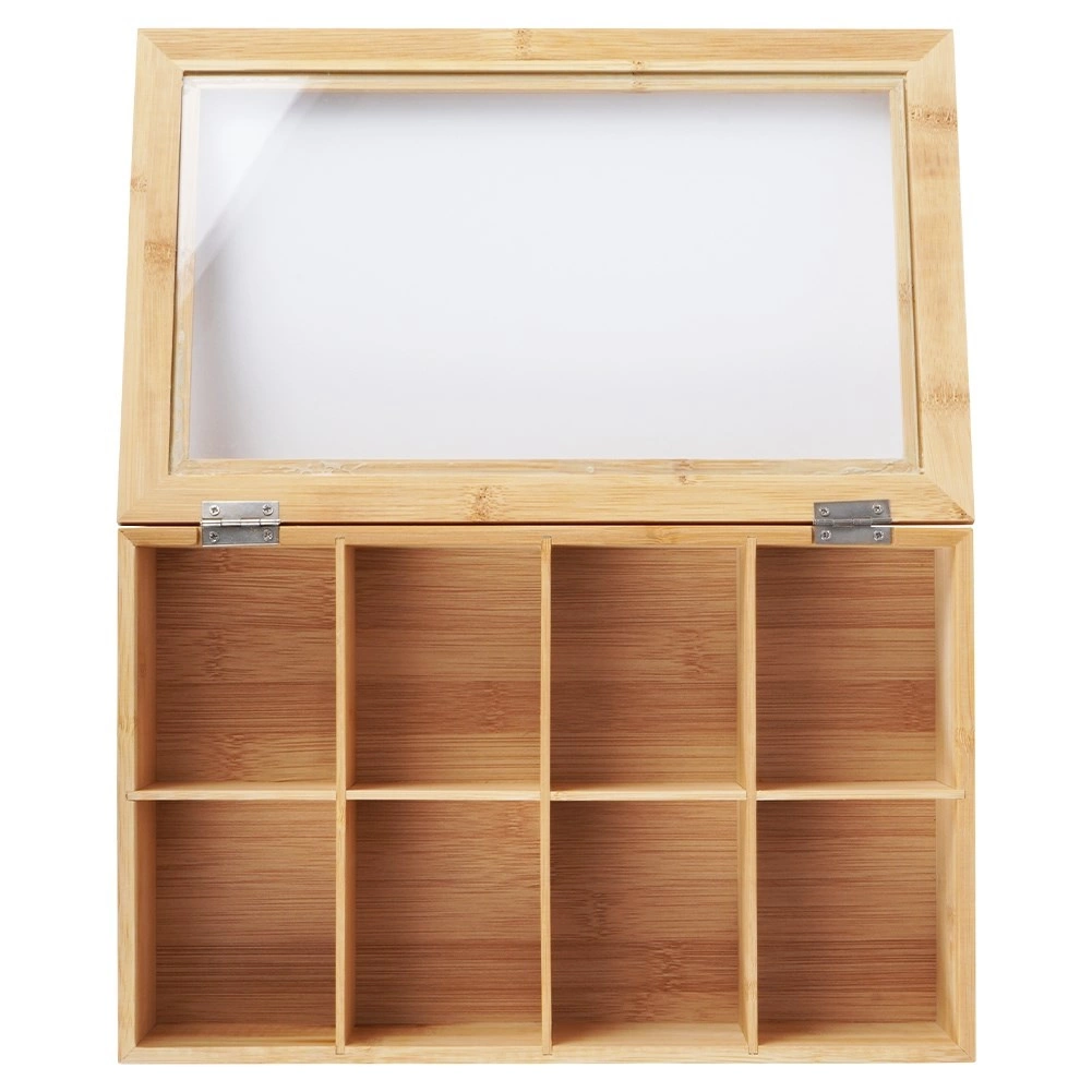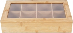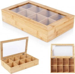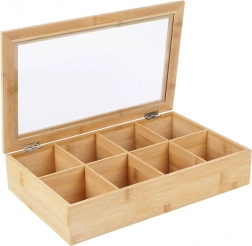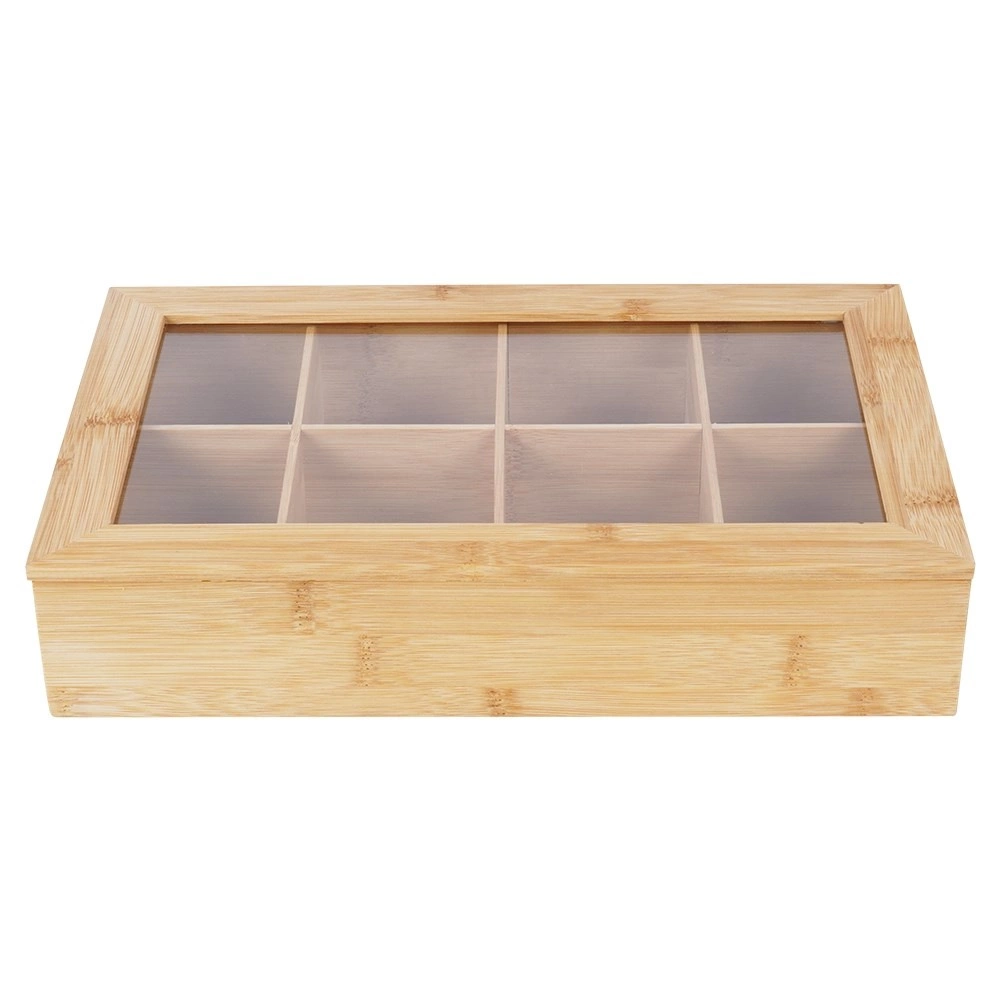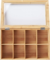 Denne stilfulde bambus teæske tilbyder en smart og æstetisk løsning til opbevaring af tebreve. Takket være otte adskilte rum sorterer du nemt forskellige typer og smagsvarianter af te. Det gennemsigtige låg giver et hurtigt overblik over indholdet uden at skulle åbne æsken.