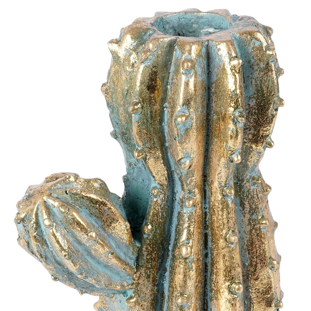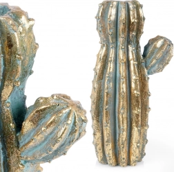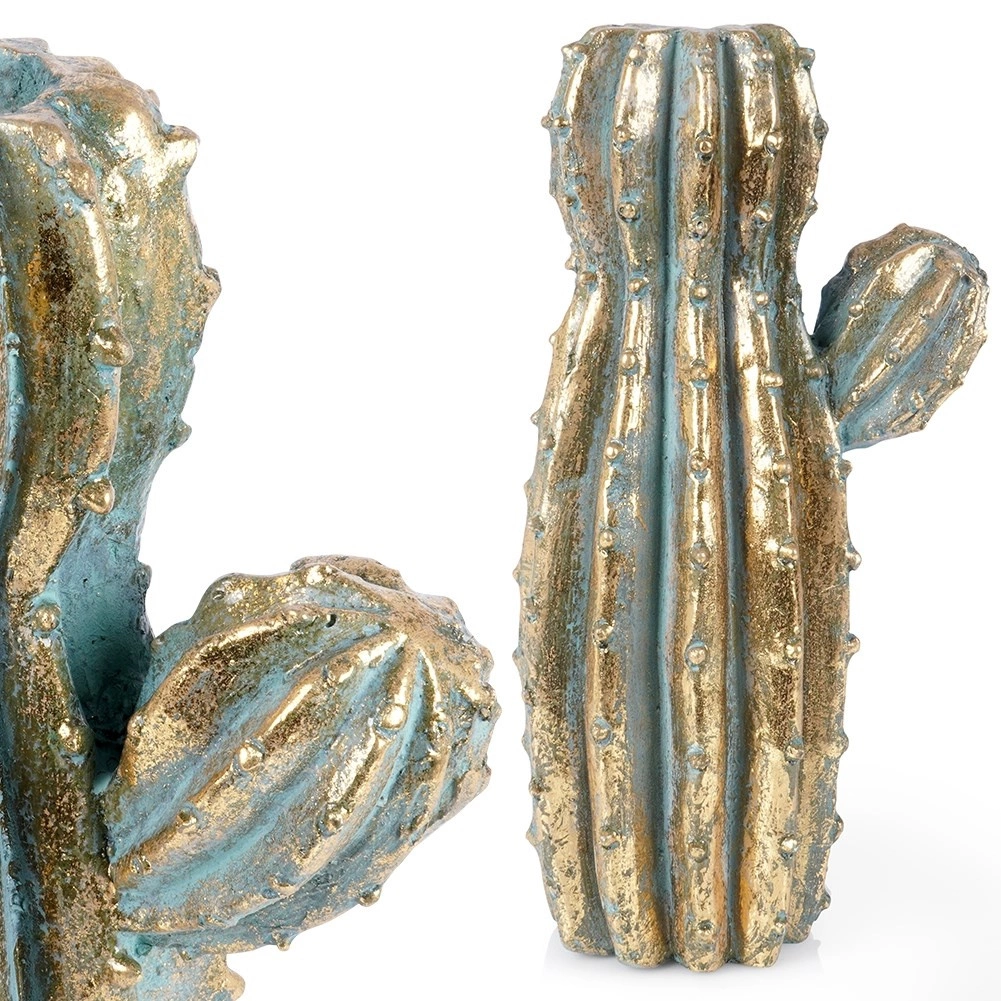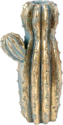 Denne dekorative vase i et attraktivt gyldent kaktus-design kombinerer et moderne udtryk med praktisk anvendelse. Den markante struktur af ribber og fine udbulinger efterligner naturens kaktus, mens den metalliske overflade med blå-grønne reflekser skaber en effektfuld accent i ethvert interiør.