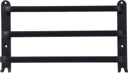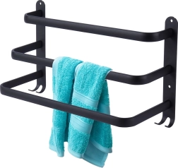 Stilren og holdbar håndklædeholder til overskuelig organisering af dit badeværelse. De tre horisontale stænger sikrer effektiv tørring og udluftning af håndklæder, mens fire kroge nederst giver plads til vaskeklude og tilbehør. Det minimalistiske design i mat sort understreger interiører i skandinavisk, moderne og loftstil.