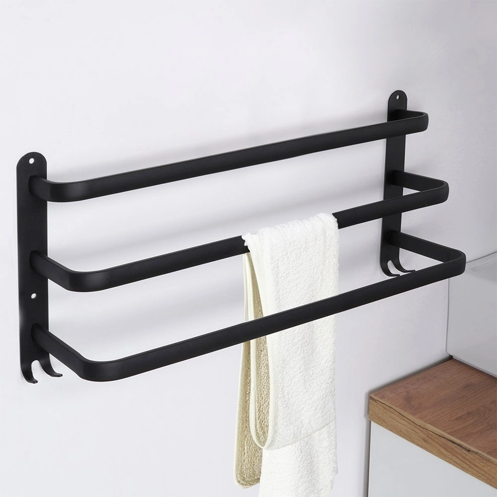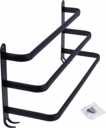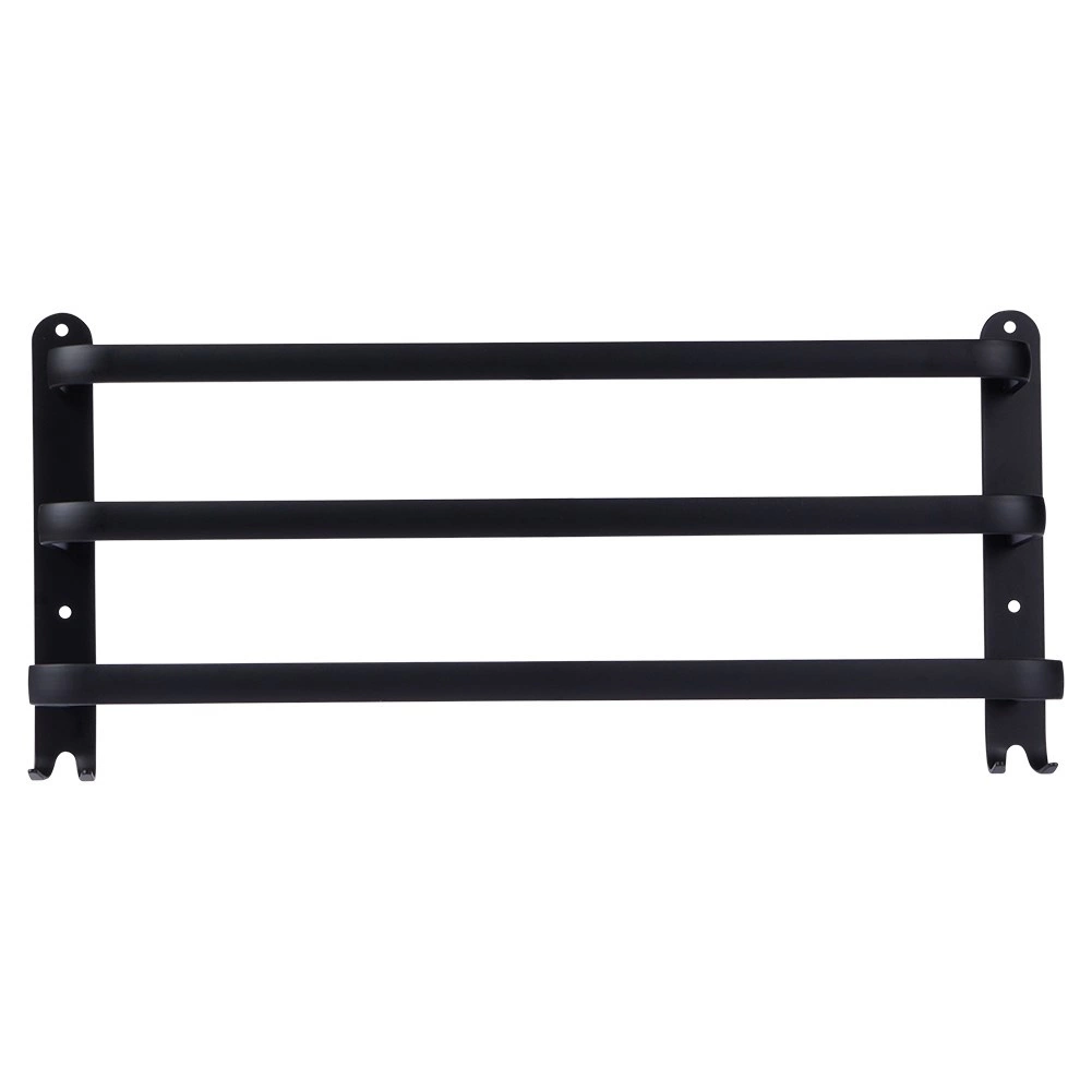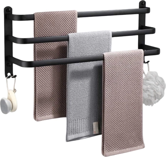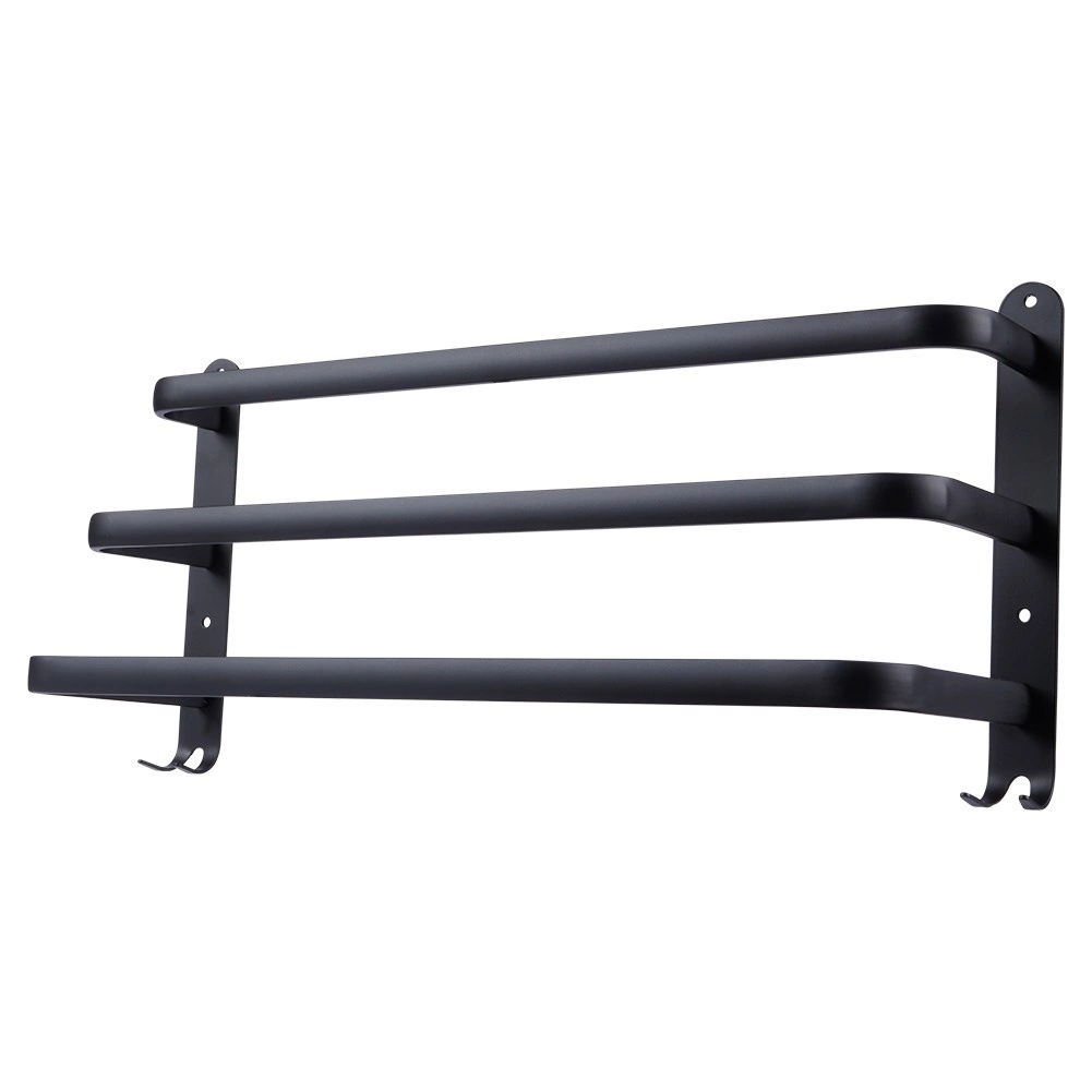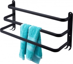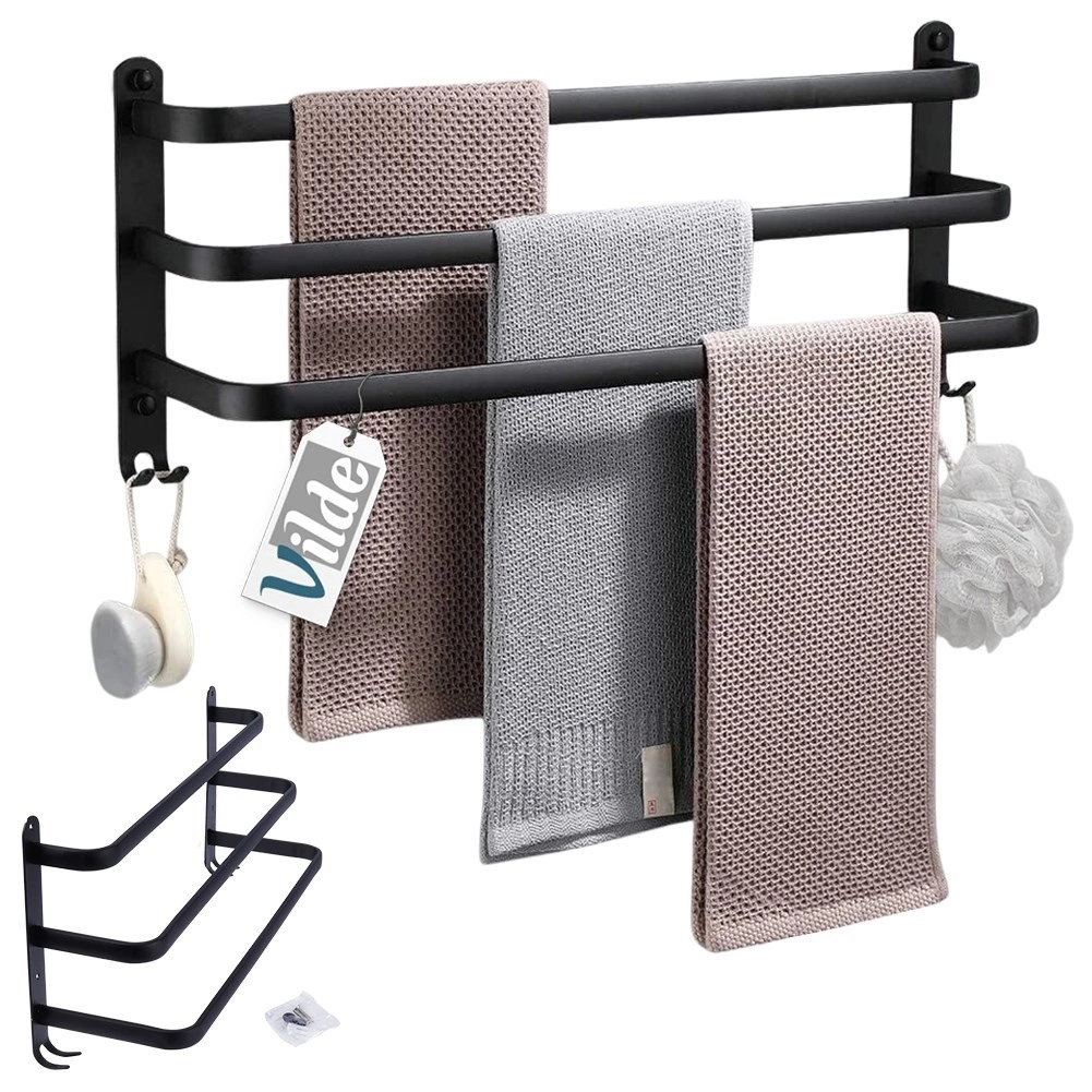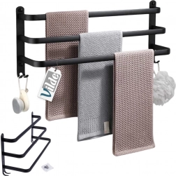 Maksimer pladsen på dit badeværelse med en praktisk håndklædeholder på 50 cm. Den robuste aluminiumskonstruktion med mat sort finish er modstandsdygtig over for fugt og samtidig stilfuld. Tre separate stænger giver bedre luftcirkulation og hurtigere tørring, mens fire nederste kroge giver plads til vaskeklude, svampe eller børster.