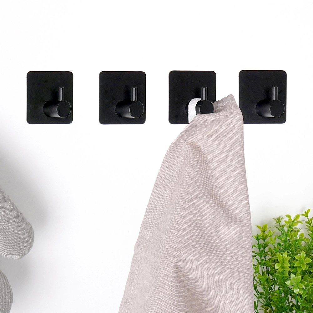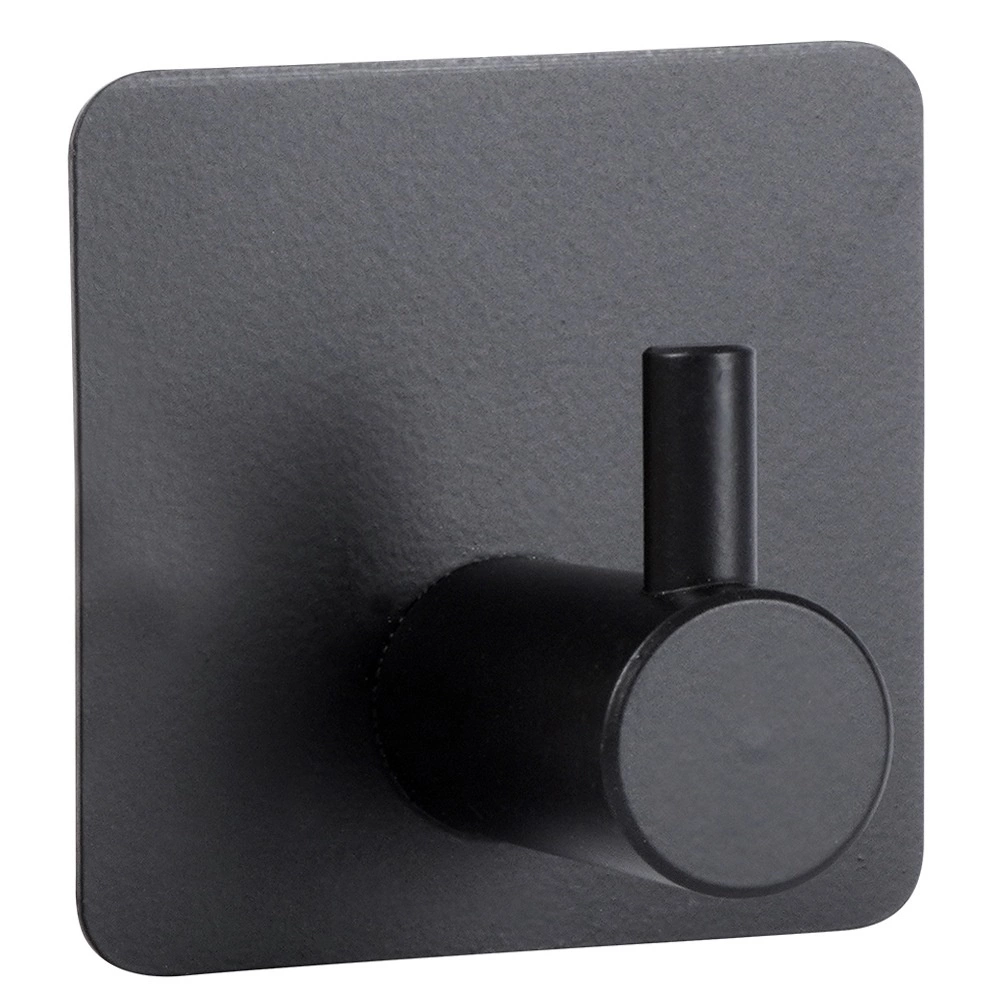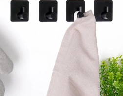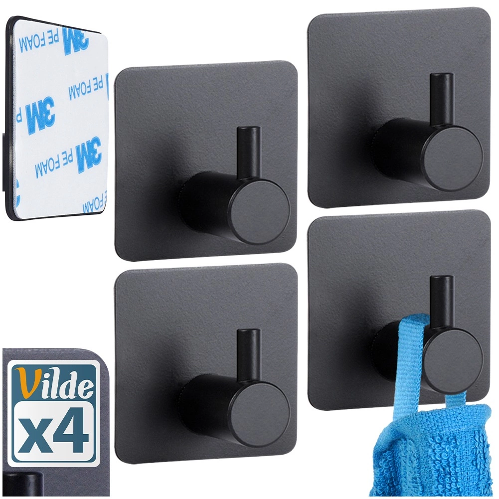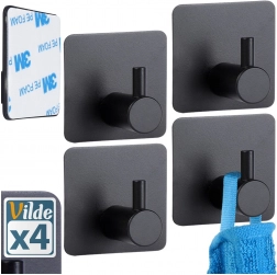 Praktisk sæt med fire selvklæbende kroge i rustfrit stål i mat sort til køkken, badeværelse og entré. Takket være den kvalitetsmæssige 3M-tape er montagen uden boring, hurtig og pålidelig. Krogene har en universel, kvadratisk form, robust udførelse og klarer en belastning på op til 1 kg til håndklæder, viskestykker eller små accessories.