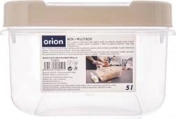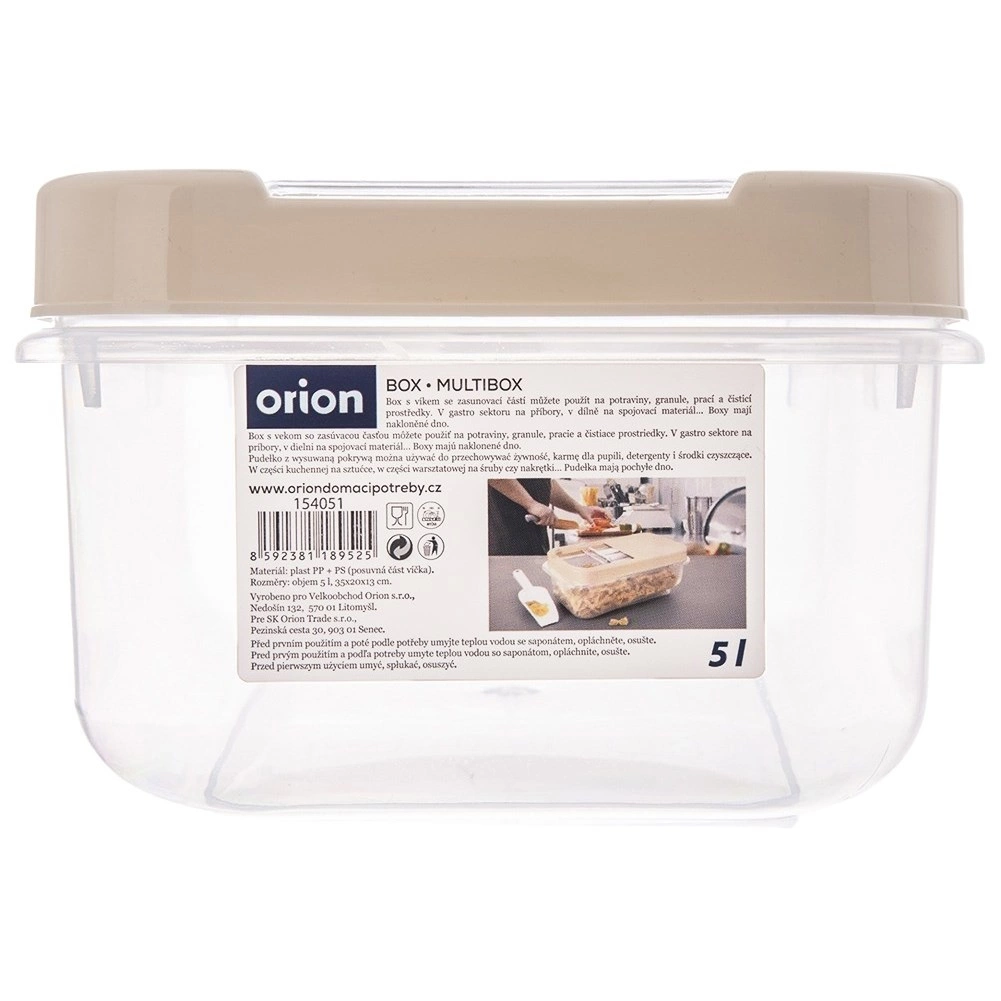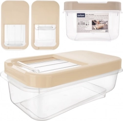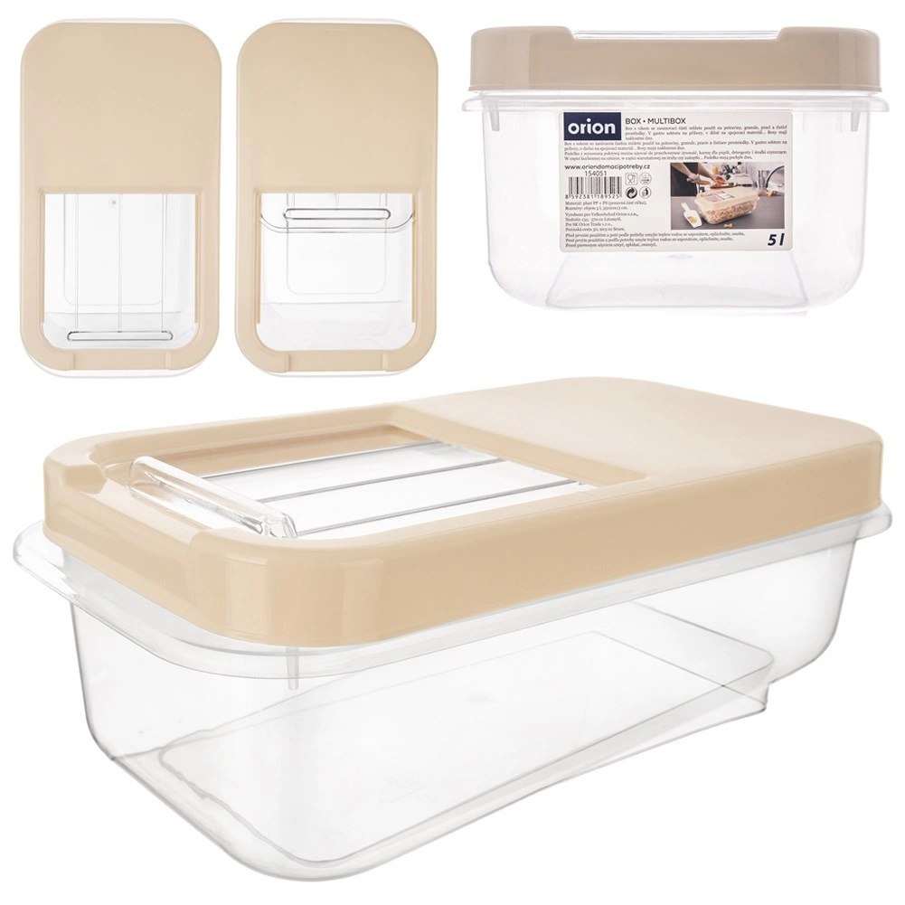 Praktisk opbevaringsboks med volumen 5 l, gennemsigtig beholder og beige låg med en integreret skydedel for nem dosering. Ideel til fødevarer, vaskekapsler og -pulver, opvasketabletter samt dyrefoder. Takket være det gennemsigtige design har du altid overblik over indholdet, og det tætsluttende låg beskytter mod fugt.
