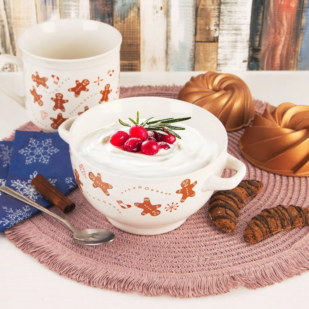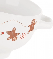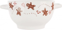 Denne keramiske bouillonskål udmærker sig ved alsidig anvendelse – perfekt til varme supper, bouillon og cremede supper, men også til morgenmadsblandinger, yoghurt med frugt, salater eller snacks. Den hvide glasur med brun-røde motiver af honningkager, hjerter og snefnug giver køkkenet en behagelig, festlig atmosfære.