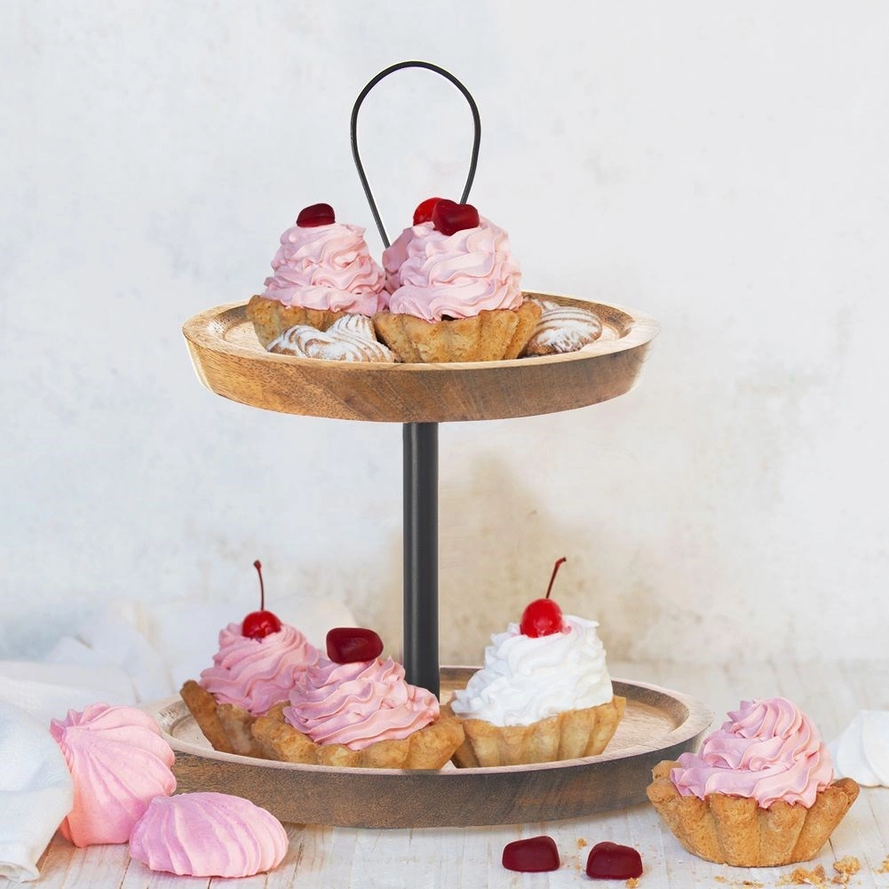 Giv din borddækning elegance og orden. Den to-etagers etagere i mangotræ gør det nemt at udstille cupcakes, småkager, desserter, frugt og salte canapéer. Med to niveauer i forskellige diametre sparer du nemt plads på bordet og bevarer en overskuelig præsentation.