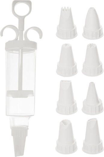 Den universelle kagedekorator til kager og småkager fyldes nemt med creme eller flødeskum og sikrer takket være stempelbetjeningen jævn og ren dosering. Den gennemsigtige cylinder lader dig holde øje med fyldeniveauet, og de udskiftelige tylle giver et bredt udvalg af dekorationer fra fine linjer til fyldige stjerner.