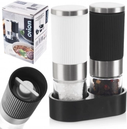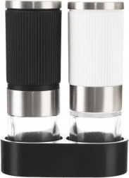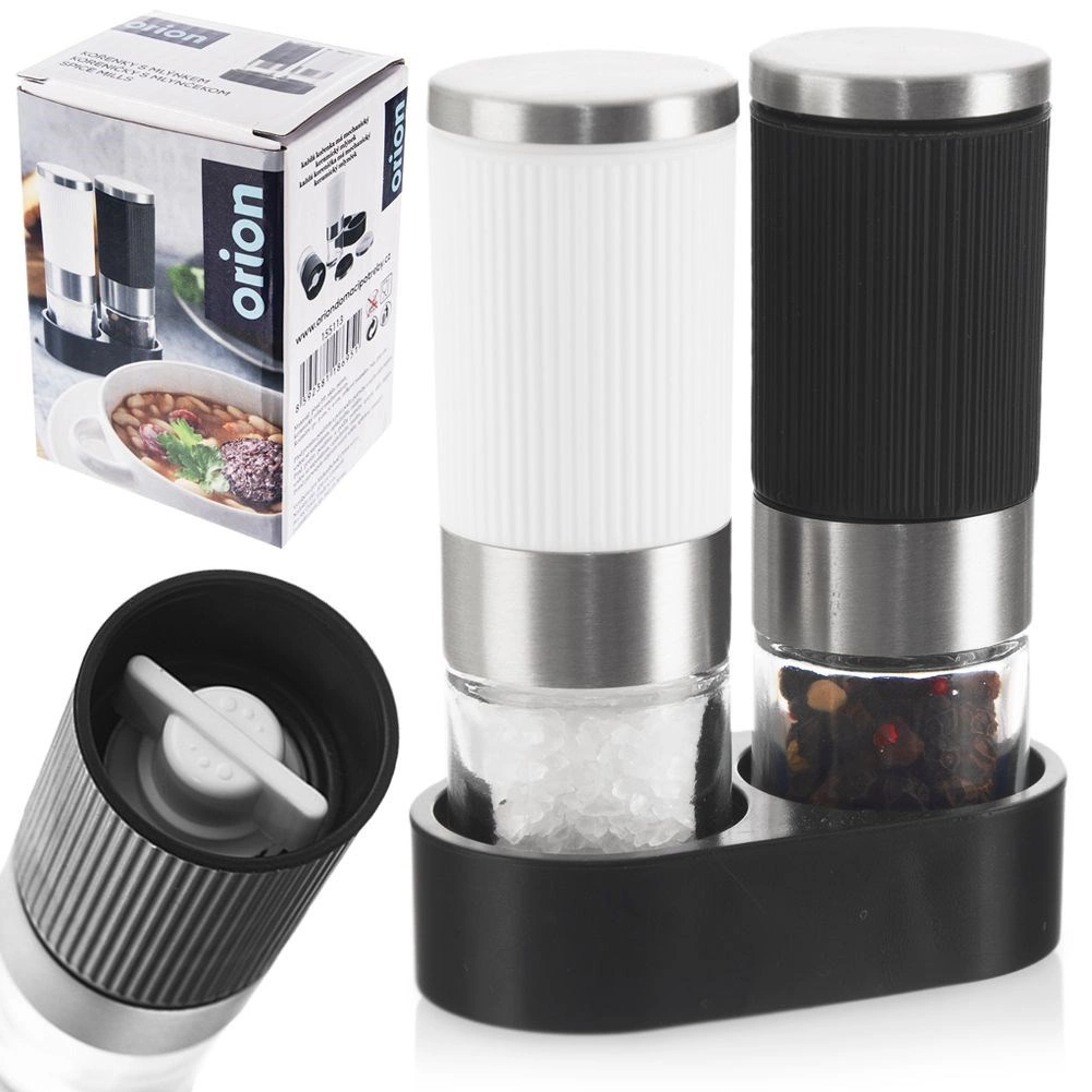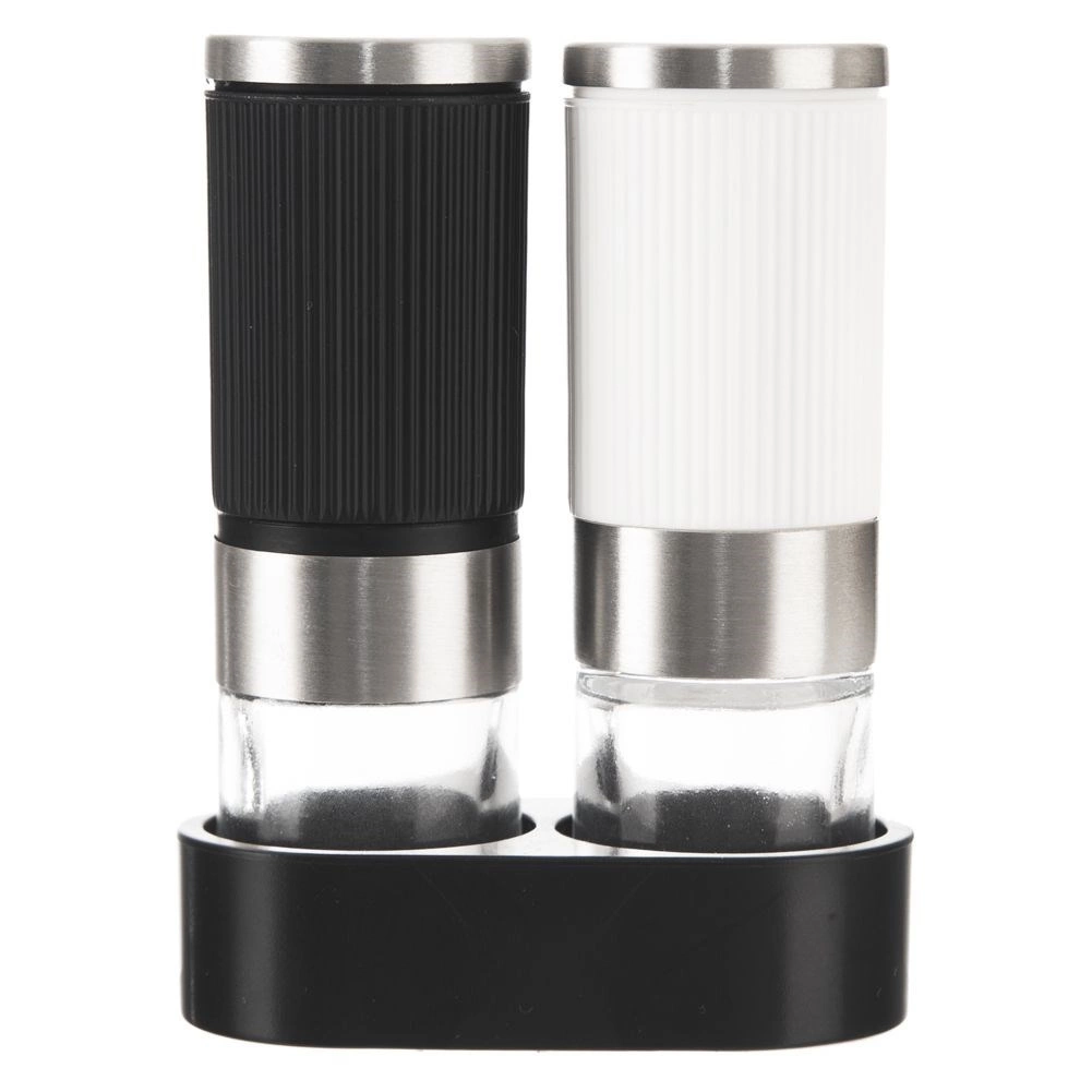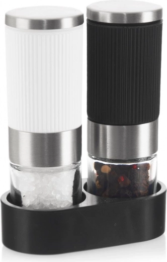 Det riflede korpus i sort og hvid ligger godt i hånden og glider ikke. Den fælles holder samler begge kværne og holder orden på bordet.