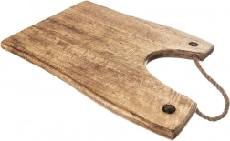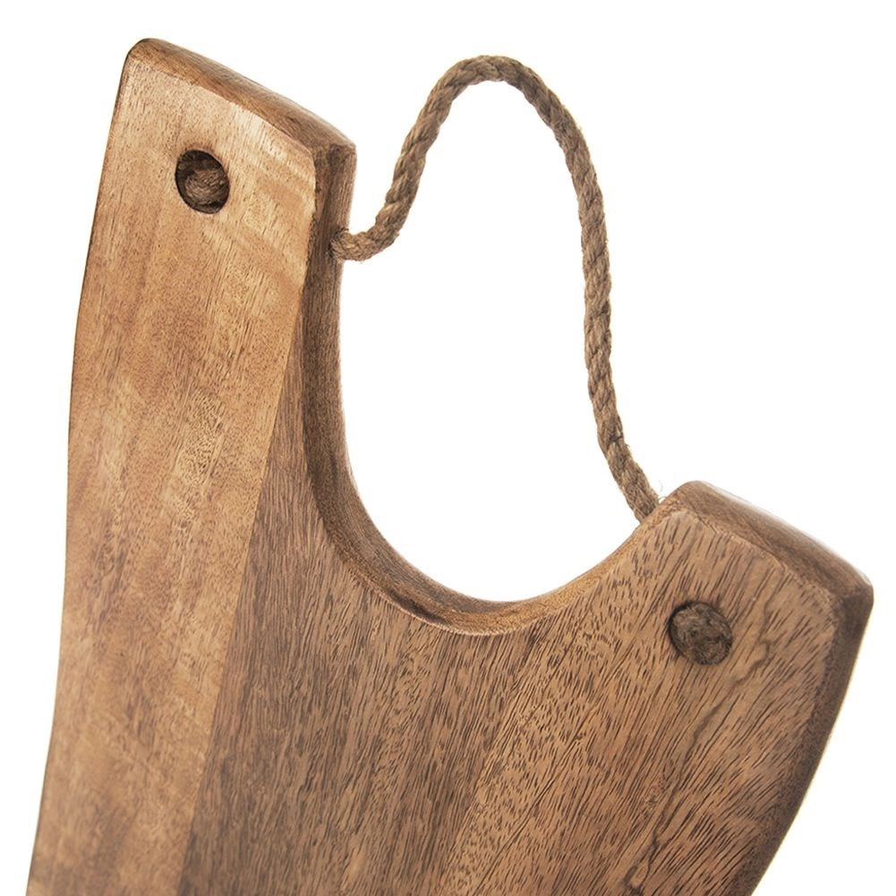 Brættet har en markant, uregelmæssig form med synlig åretegning og en praktisk strop af jutereb for nem transport og ophængning. Den massive udførelse beskytter køkkenbordet mod ridser og sikrer lang levetid.