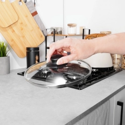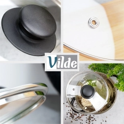 Rustfri stålkant, solidt greb og varmebestandighed op til 200 °C. Låget kan vaskes i opvaskemaskinen for hurtig og hygiejnisk rengøring.