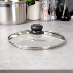Det praktiske glaslåg er et fremragende supplement til kogegrej med en diameter på 22 cm. Varmeresistent, gennemsigtigt glas med kant i rustfrit stål og et robust håndtag af sort plast sikrer lang levetid og sikker brug. Låget er egnet til opvaskemaskine og modstandsdygtigt over for temperaturer op til 200 °C.