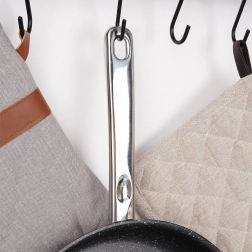 Poleret rustfrit stål er stærkt og slidstærkt. Håndtaget med øje gør det nemt at hænge panden på en køkkenskinne.