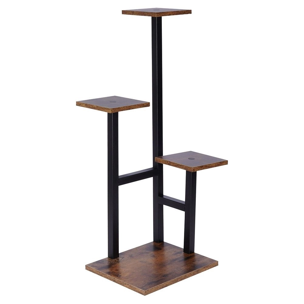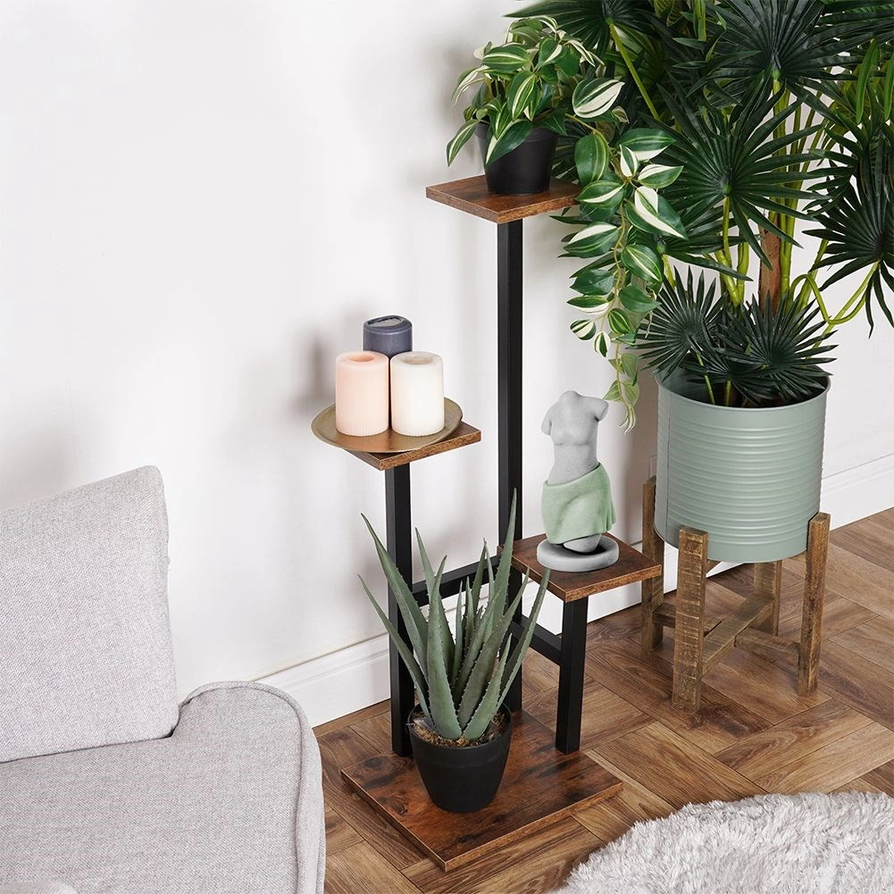 Denne fleretagers blomsterstander kombinerer sort metalkonstruktion med MDF-hylder i mørkt trælook. Dens trinvis design gør det muligt at fremvise flere planter på et lille areal og skabe en attraktiv grøn komposition i enhver indretning.