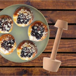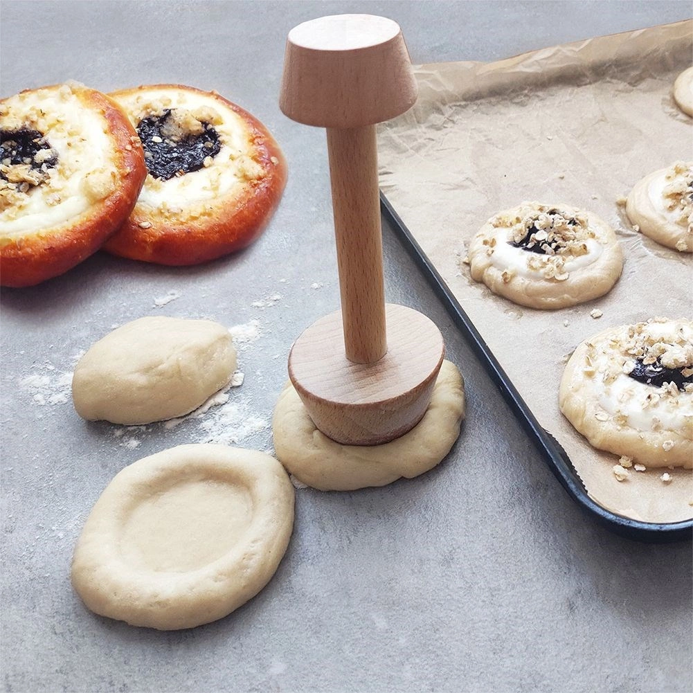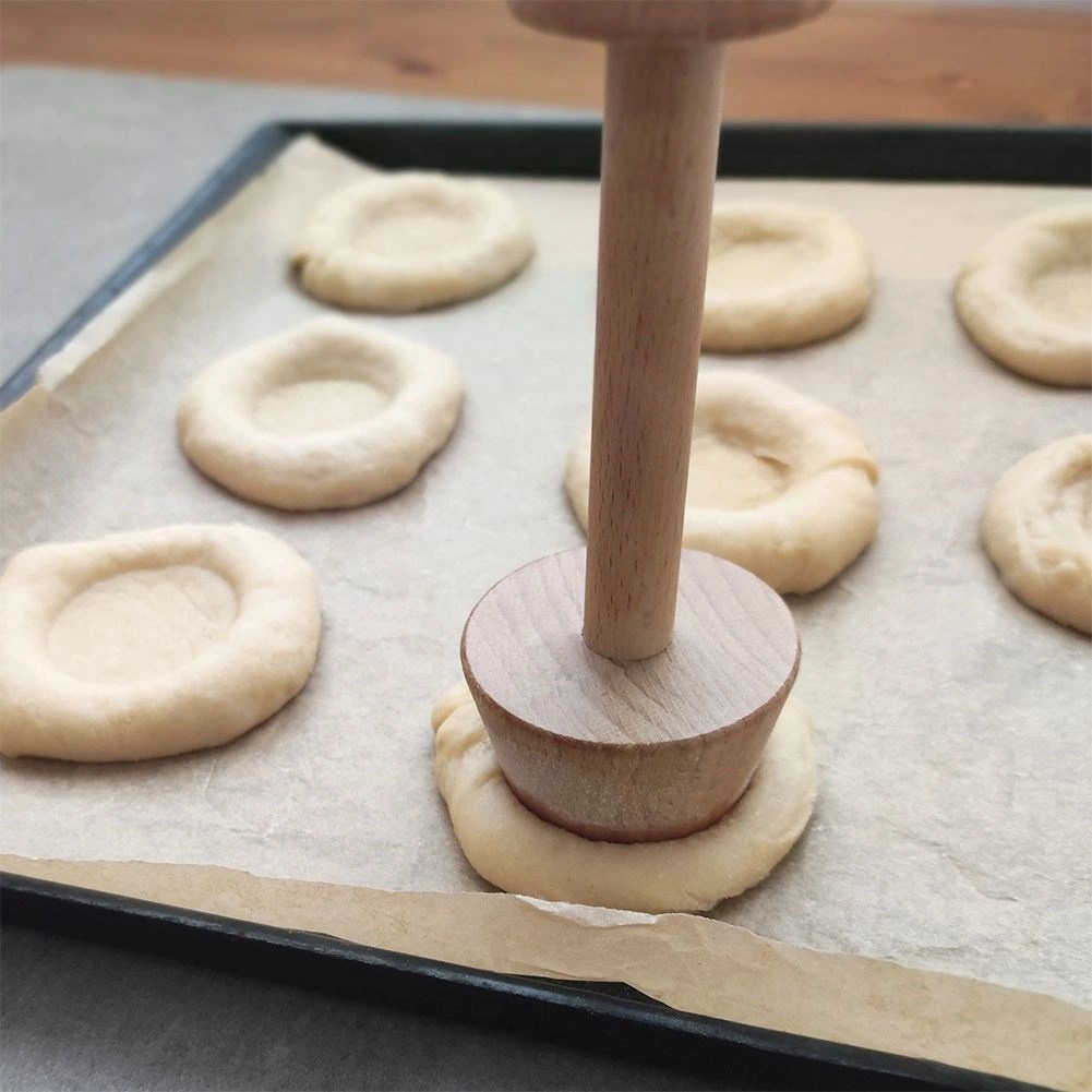 Dette dobbeltendede stempel gør det nemt at forberede tartelletter, tærter, småkager og gærbagværk. Det lille hoved (4 cm) er ideelt til mini-tartelletter og små forme, det større (5,5 cm) til formning i større forme og til at lave jævne fordybninger til fyld som creme, marmelade, flødeost eller frugt. Takket være den naturligt glatte overflade af bøgetræ hænger dejen ikke fast, og formningen bliver hurtig og præcis.