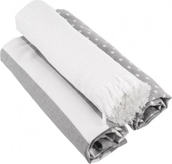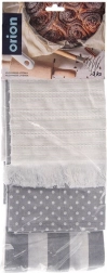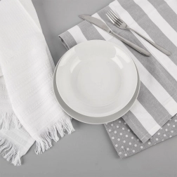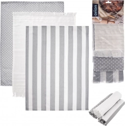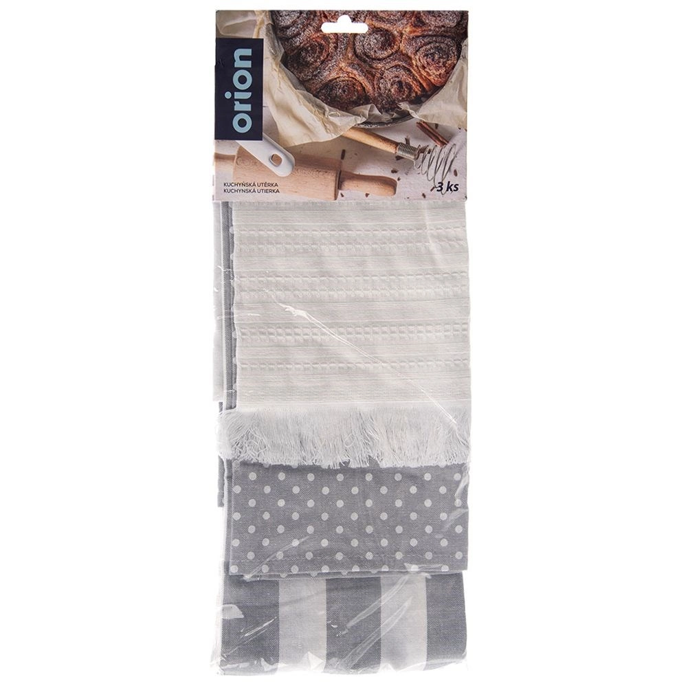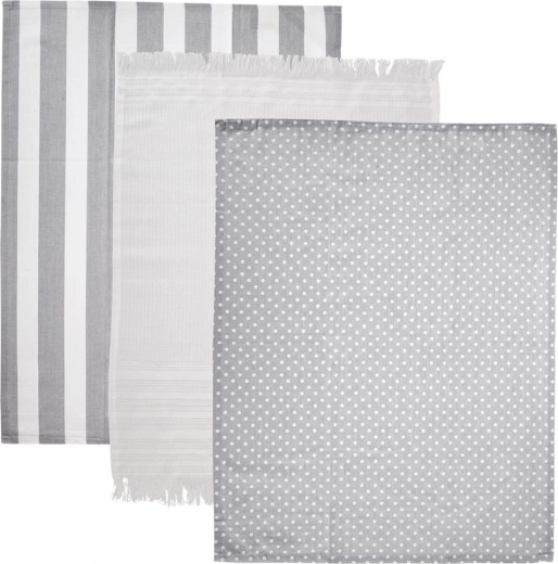 Sæt med 3 kvalitets-køkkenhåndklæder i moderne mønstre – striber, prikker og helt hvid med frynser – passer perfekt i ethvert køkken. Takket være 100% bomuld har de fremragende sugeevne og er behagelige at røre ved, samtidig med at de forbliver stærke og holdbare til daglig brug.
