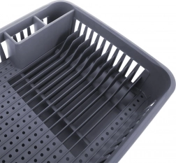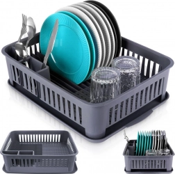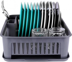 Stativer rummer op til 12 tallerkener, tilbyder plads til skåle, krus og glas og har en bestikbeholder med to rum for overskuelig organisering. Den neutrale grå farve passer let til enhver køkkenstil, og den er nem at vedligeholde – tag blot bakken ud og skyl.