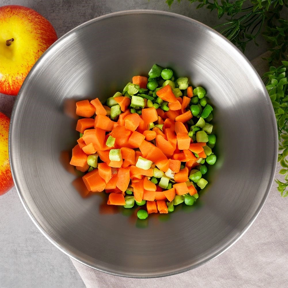 Den er perfekt til forberedelse af deje, blanding af salater, piskning af æggehvider samt til servering af dips og snacks. Materialet i rustfrit stål er modstandsdygtigt over for lugte og pletter, let at rengøre og sikkert for helbredet. Skålen kan også bruges til opbevaring i køleskabet.
