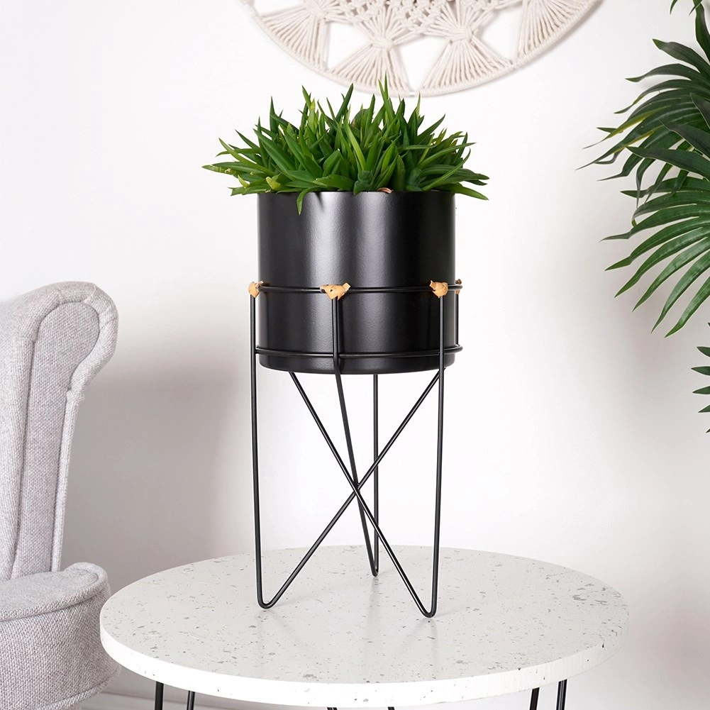 Det trådformede stativ med krydsede ben og metalkrukken giver sikkerhed og lang holdbarhed, så dine planter står stabilt og synligt.