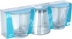 Opdag et praktisk og tidløst sæt med 3 glas på 220 ml, som passer perfekt til vand, lemonader, juice, iste og blandede drikke. Det klare glas med lodrette riller fremhæver drikkens farve og giver samtidig et mere sikkert greb.