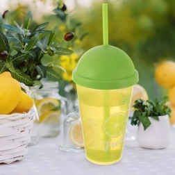 Dette alsidige krus med låg og sugerør udmærker sig ved sin lethed, holdbarhed og friske citruslook. Perfekt til vand, lemonader, juicer, cocktails og hjemmelavede iskolde drikke. Takket være kuppellåget forbliver drikken længere frisk og fri for uønskede urenheder.